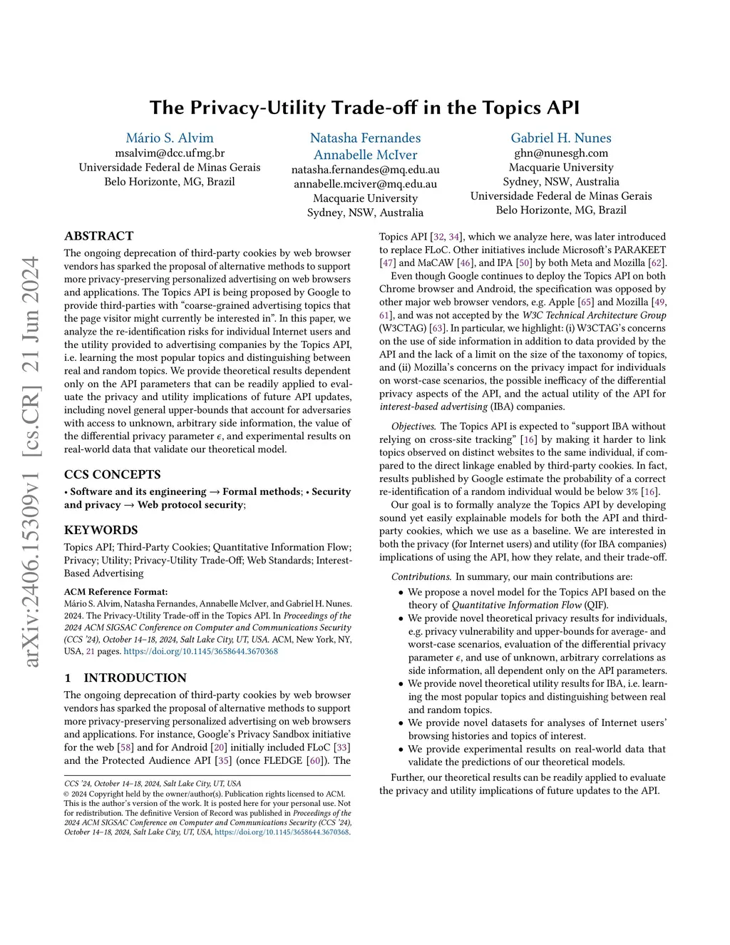 The ongoing deprecation of third-party cookies by web browser vendors has sparked the proposal of alternative methods to support more privacy-preserving personalized advertising on web browsers and applications. The Topics API is being proposed by Google to provide third-parties with "coarse-grained advertising topics that the page visitor might currently be interested in". In this paper, we analyze the re-identification risks for individual Internet users and the utility provided to advertising companies by the Topics API, i.e. learning the most popular topics and distinguishing between real and random topics. We provide theoretical results dependent only on the API parameters that can be readily applied to evaluate the privacy and utility implications of future API updates, including novel general upper-bounds that account for adversaries with access to unknown, arbitrary side information, the value of the differential privacy parameter , and experimental results on real-world data that validate our theoretical model.