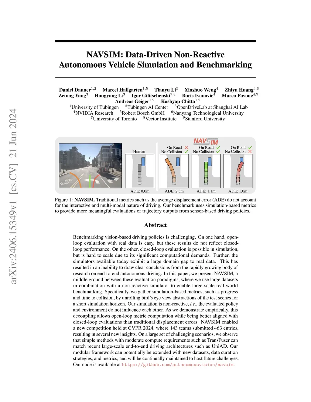 Benchmarking vision-based driving policies is challenging. On one hand, open-loop evaluation with real data is easy, but these results do not reflect closed-loop performance. On the other, closed-loop evaluation is possible in simulation, but is hard to scale due to its significant computational demands. Further, the simulators available today exhibit a large domain gap to real data. This has resulted in an inability to draw clear conclusions from the rapidly growing body of research on end-to-end autonomous driving. In this paper, we present NAVSIM, a middle ground between these evaluation paradigms, where we use large datasets in combination with a non-reactive simulator to enable large-scale real-world benchmarking. Specifically, we gather simulation-based metrics, such as progress and time to collision, by unrolling bird's eye view abstractions of the test scenes for a short simulation horizon. Our simulation is non-reactive, i.e., the evaluated policy and environment do not influence each other. As we demonstrate empirically, this decoupling allows open-loop metric computation while being better aligned with closed-loop evaluations than traditional displacement errors. NAVSIM enabled a new competition held at CVPR 2024, where 143 teams submitted 463 entries, resulting in several new insights. On a large set of challenging scenarios, we observe that simple methods with moderate compute requirements such as TransFuser can match recent large-scale end-to-end driving architectures such as UniAD. Our modular framework can potentially be extended with new datasets, data curation strategies, and metrics, and will be continually maintained to host future challenges. Our code is available at https://github.com/autonomousvision/navsim.