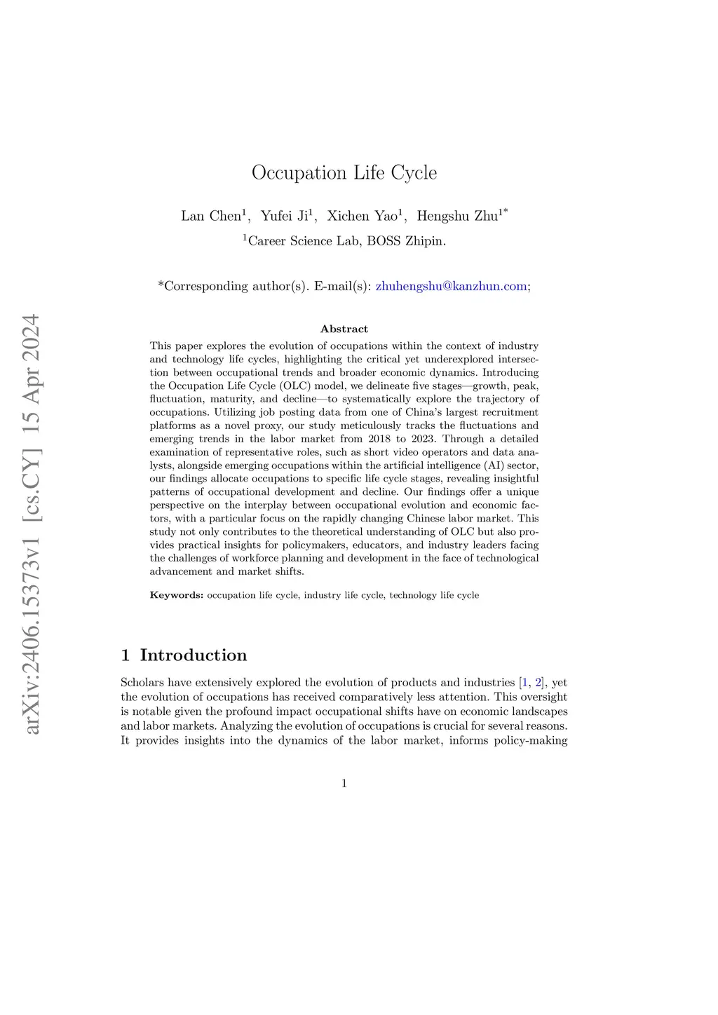 This paper explores the evolution of occupations within the context of industry and technology life cycles, highlighting the critical yet underexplored intersection between occupational trends and broader economic dynamics. Introducing the Occupation Life Cycle (OLC) model, we delineate five stages (i.e., growth, peak, fluctuation, maturity, and decline) to systematically explore the trajectory of occupations. Utilizing job posting data from one of China's largest recruitment platforms as a novel proxy, our study meticulously tracks the fluctuations and emerging trends in the labor market from 2018 to 2023. Through a detailed examination of representative roles, such as short video operators and data analysts, alongside emerging occupations within the artificial intelligence (AI) sector, our findings allocate occupations to specific life cycle stages, revealing insightful patterns of occupational development and decline. Our findings offer a unique perspective on the interplay between occupational evolution and economic factors, with a particular focus on the rapidly changing Chinese labor market. This study not only contributes to the theoretical understanding of OLC but also provides practical insights for policymakers, educators, and industry leaders facing the challenges of workforce planning and development in the face of technological advancement and market shifts.
