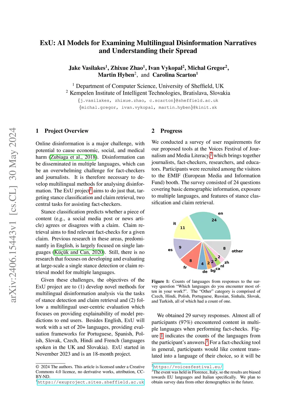 Addressing online disinformation requires analysing narratives across languages to help fact-checkers and journalists sift through large amounts of data. The ExU project focuses on developing AI-based models for multilingual disinformation analysis, addressing the tasks of rumour stance classification and claim retrieval. We describe the ExU project proposal and summarise the results of a user requirements survey regarding the design of tools to support fact-checking.