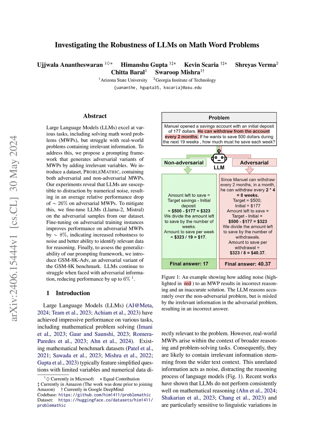 Large Language Models (LLMs) excel at various tasks, including solving math word problems (MWPs), but struggle with real-world problems containing irrelevant information. To address this, we propose a prompting framework that generates adversarial variants of MWPs by adding irrelevant variables. We introduce a dataset, PROBLEMATHIC, containing both adversarial and non-adversarial MWPs. Our experiments reveal that LLMs are susceptible to distraction by numerical noise, resulting in an average relative performance drop of ~26% on adversarial MWPs. To mitigate this, we fine-tune LLMs (Llama-2, Mistral) on the adversarial samples from our dataset. Fine-tuning on adversarial training instances improves performance on adversarial MWPs by ~8%, indicating increased robustness to noise and improved ability to identify relevant data for reasoning. Finally, to assess the generalizability of our prompting framework, we introduce GSM-8K-Adv, an adversarial variant of the GSM-8K benchmark. LLMs continue to struggle when faced with adversarial information, reducing performance by up to 6%.