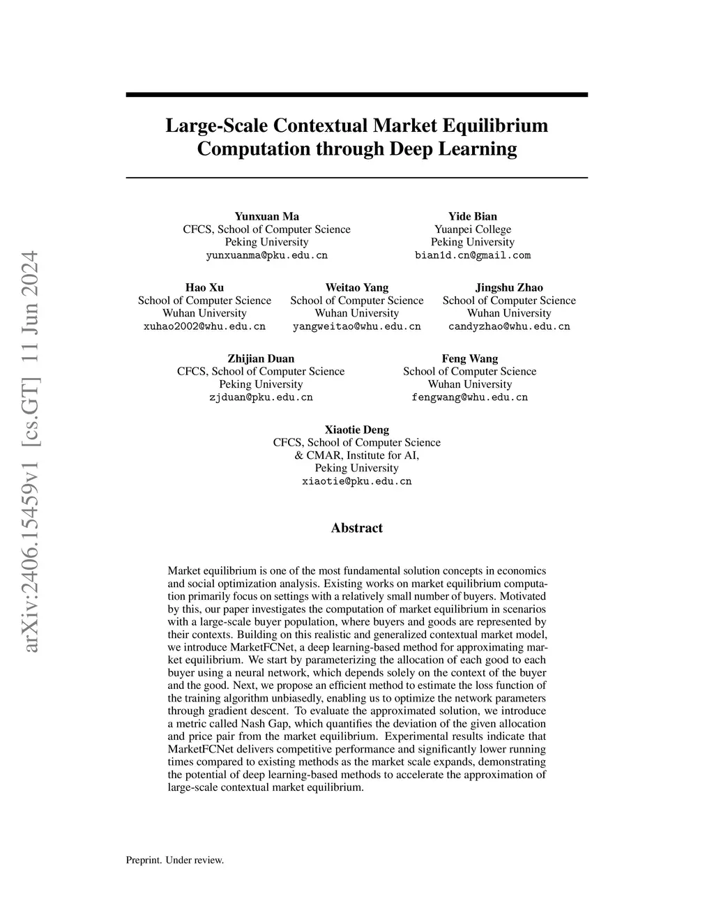 Market equilibrium is one of the most fundamental solution concepts in economics and social optimization analysis. Existing works on market equilibrium computation primarily focus on settings with relatively few buyers. Motivated by this, our paper investigates the computation of market equilibrium in scenarios with a large-scale buyer population, where buyers and goods are represented by their contexts. Building on this realistic and generalized contextual market model, we introduce MarketFCNet, a deep learning-based method for approximating market equilibrium. We start by parameterizing the allocation of each good to each buyer using a neural network, which depends solely on the context of the buyer and the good. Next, we propose an efficient method to unbiasedly estimate the loss function of the training algorithm, enabling us to optimize the network parameters through gradient. To evaluate the approximated solution, we propose a metric called Nash Gap, which quantifies the deviation of the given allocation and price pair from the market equilibrium. Experimental results indicate that MarketFCNet delivers competitive performance and significantly lower running times compared to existing methods as the market scale expands, demonstrating the potential of deep learning-based methods to accelerate the approximation of large-scale contextual market equilibrium.