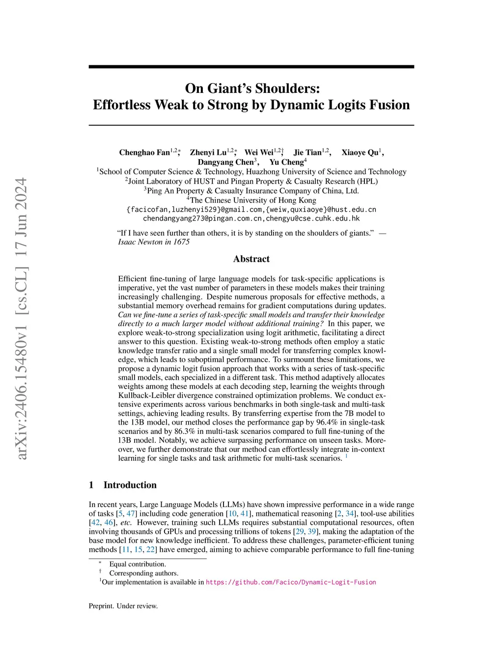 On Giant's Shoulders: Effortless Weak to Strong by Dynamic Logits Fusion