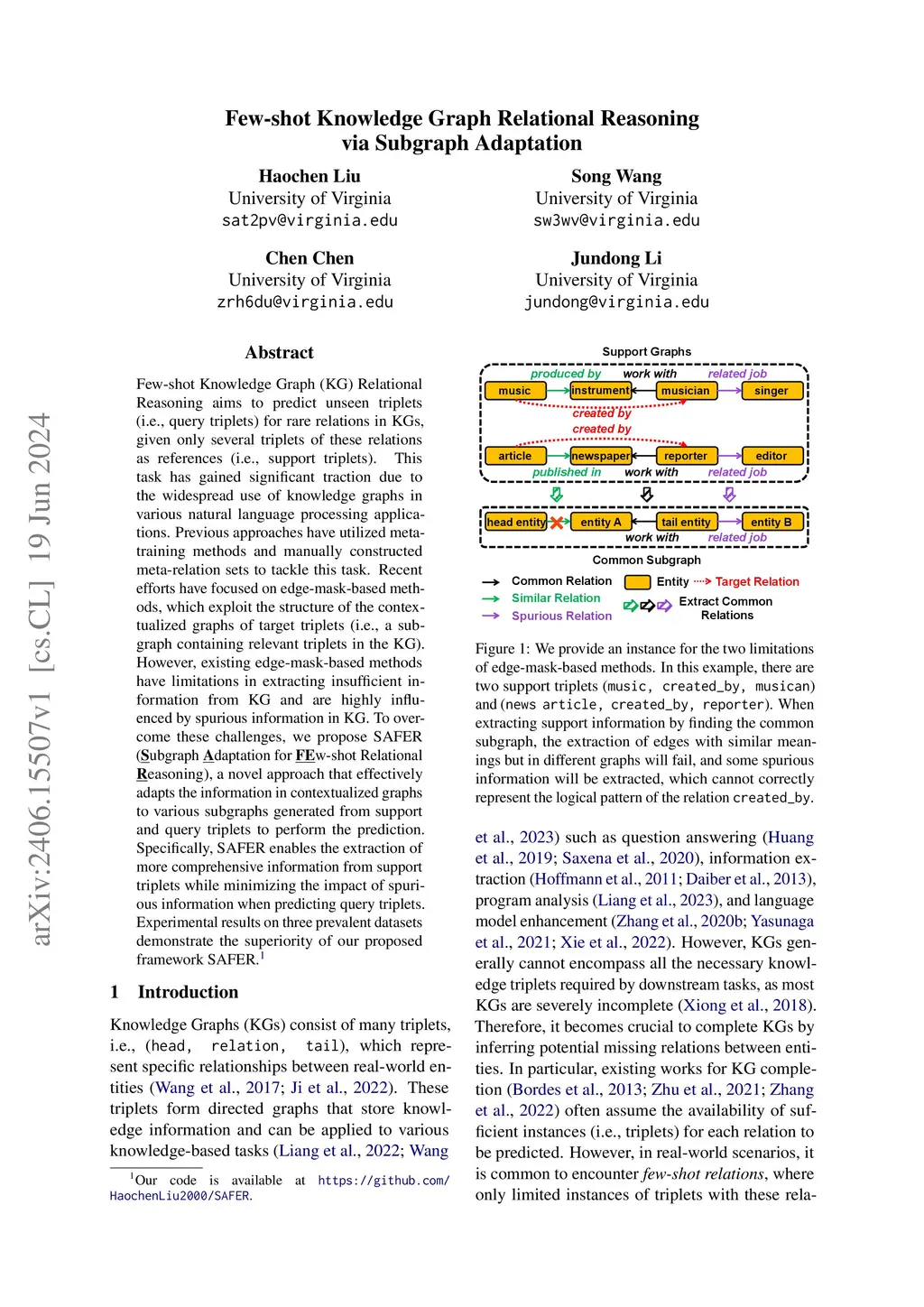 Few-shot Knowledge Graph (KG) Relational Reasoning aims to predict unseen triplets (i.e., query triplets) for rare relations in KGs, given only several triplets of these relations as references (i.e., support triplets). This task has gained significant traction due to the widespread use of knowledge graphs in various natural language processing applications. Previous approaches have utilized meta-training methods and manually constructed meta-relation sets to tackle this task. Recent efforts have focused on edge-mask-based methods, which exploit the structure of the contextualized graphs of target triplets (i.e., a subgraph containing relevant triplets in the KG). However, existing edge-mask-based methods have limitations in extracting insufficient information from KG and are highly influenced by spurious information in KG. To overcome these challenges, we propose SAFER (Subgraph Adaptation for Few-shot Relational Reasoning), a novel approach that effectively adapts the information in contextualized graphs to various subgraphs generated from support and query triplets to perform the prediction. Specifically, SAFER enables the extraction of more comprehensive information from support triplets while minimizing the impact of spurious information when predicting query triplets. Experimental results on three prevalent datasets demonstrate the superiority of our proposed framework SAFER.