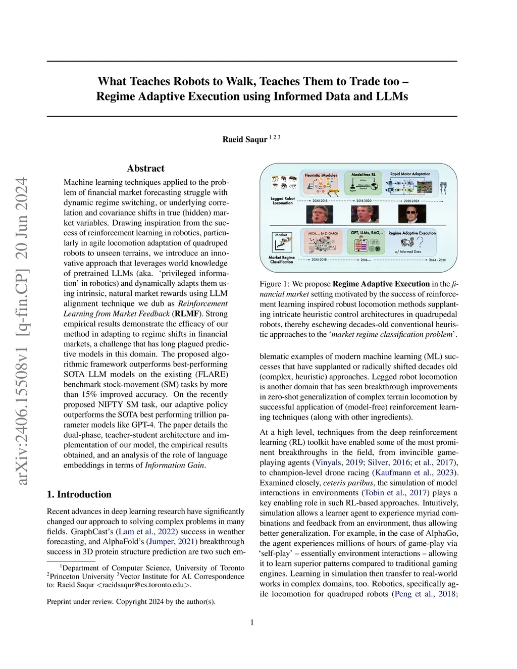 Machine learning techniques applied to the problem of financial market forecasting struggle with dynamic regime switching, or underlying correlation and covariance shifts in true (hidden) market variables. Drawing inspiration from the success of reinforcement learning in robotics, particularly in agile locomotion adaptation of quadruped robots to unseen terrains, we introduce an innovative approach that leverages world knowledge of pretrained LLMs (aka. 'privileged information' in robotics) and dynamically adapts them using intrinsic, natural market rewards using LLM alignment technique we dub as "Reinforcement Learning from Market Feedback" (**RLMF**). Strong empirical results demonstrate the efficacy of our method in adapting to regime shifts in financial markets, a challenge that has long plagued predictive models in this domain. The proposed algorithmic framework outperforms best-performing SOTA LLM models on the existing (FLARE) benchmark stock-movement (SM) tasks by more than 15\% improved accuracy. On the recently proposed NIFTY SM task, our adaptive policy outperforms the SOTA best performing trillion parameter models like GPT-4. The paper details the dual-phase, teacher-student architecture and implementation of our model, the empirical results obtained, and an analysis of the role of language embeddings in terms of Information Gain.