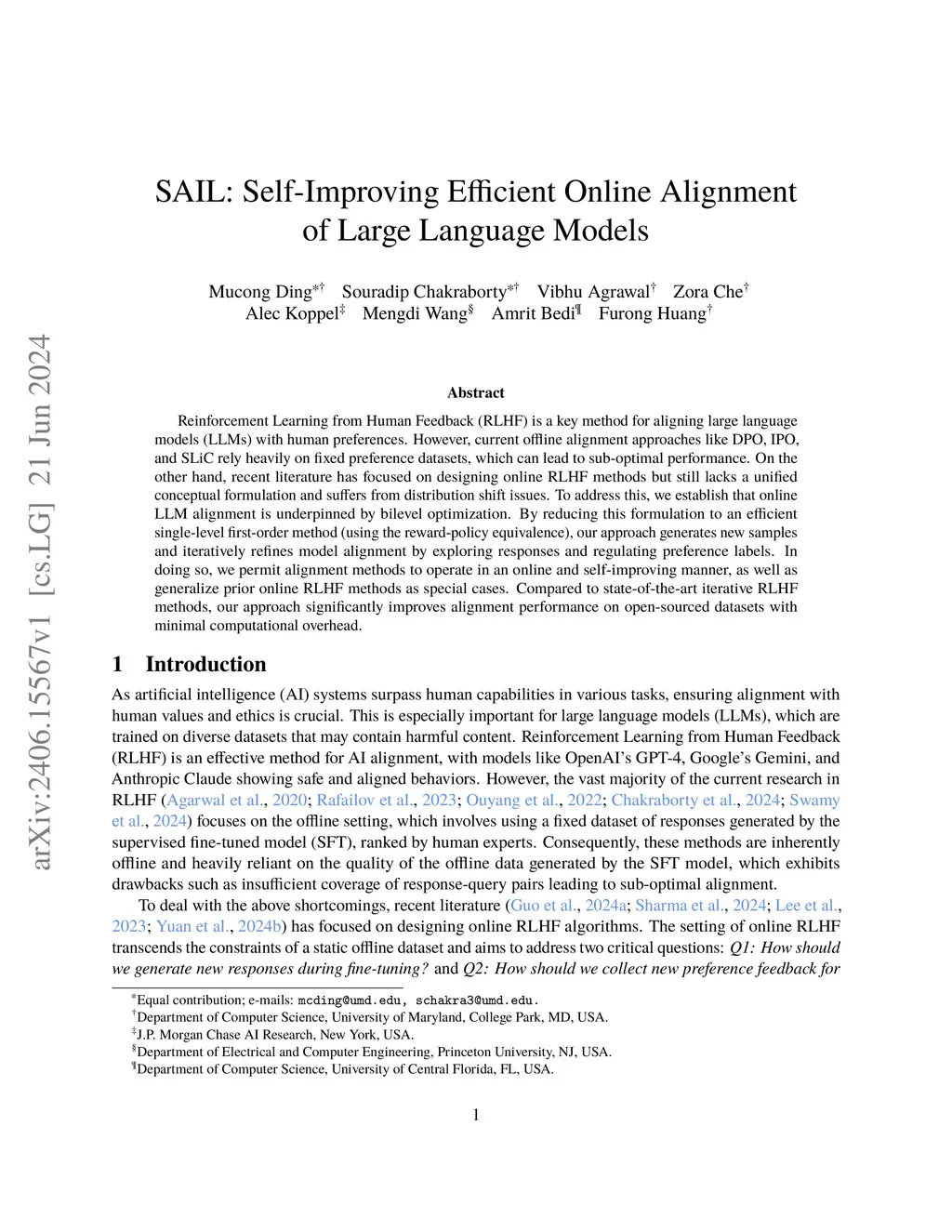 SAIL: Self-Improving Efficient Online Alignment of Large Language Models