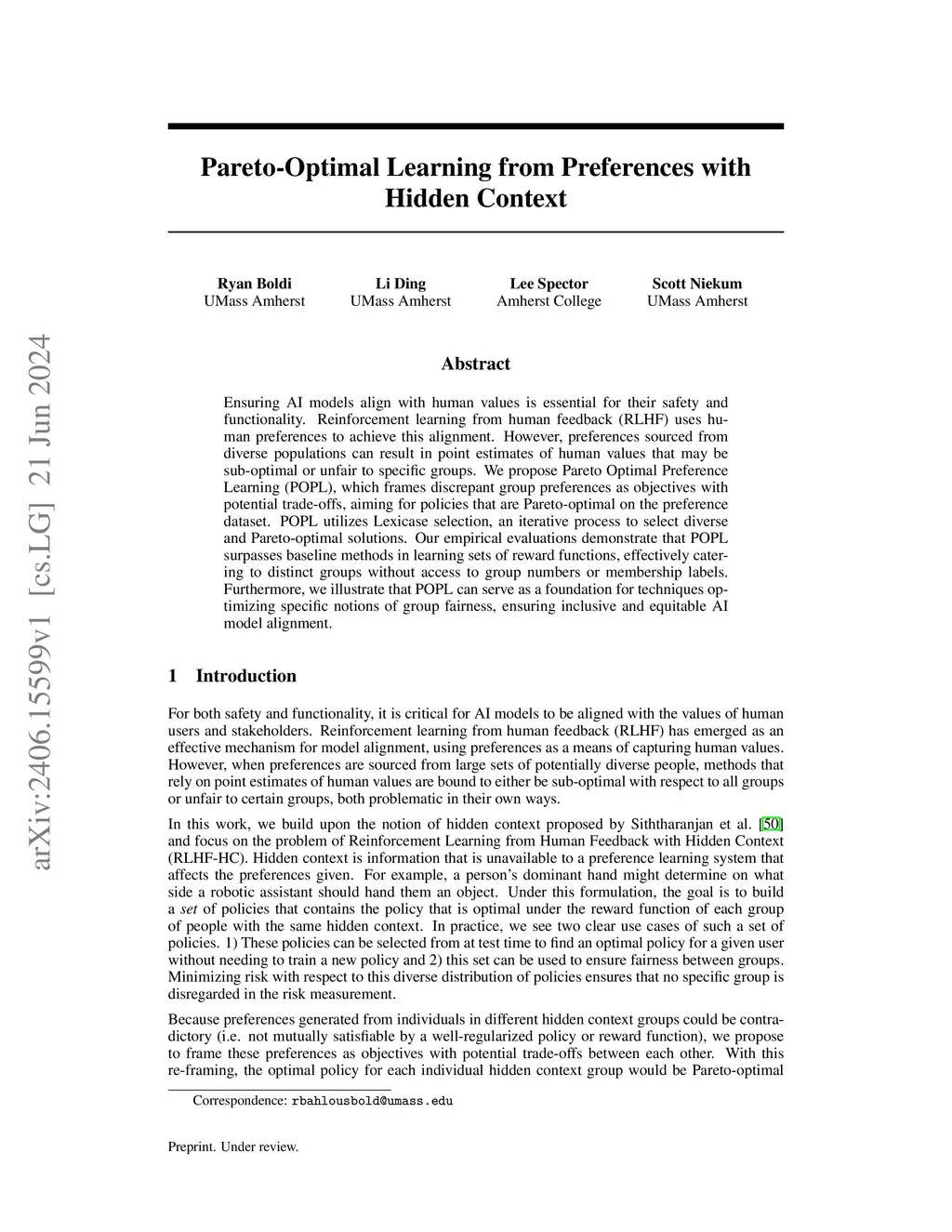 Pareto-Optimal Learning from Preferences with Hidden Context