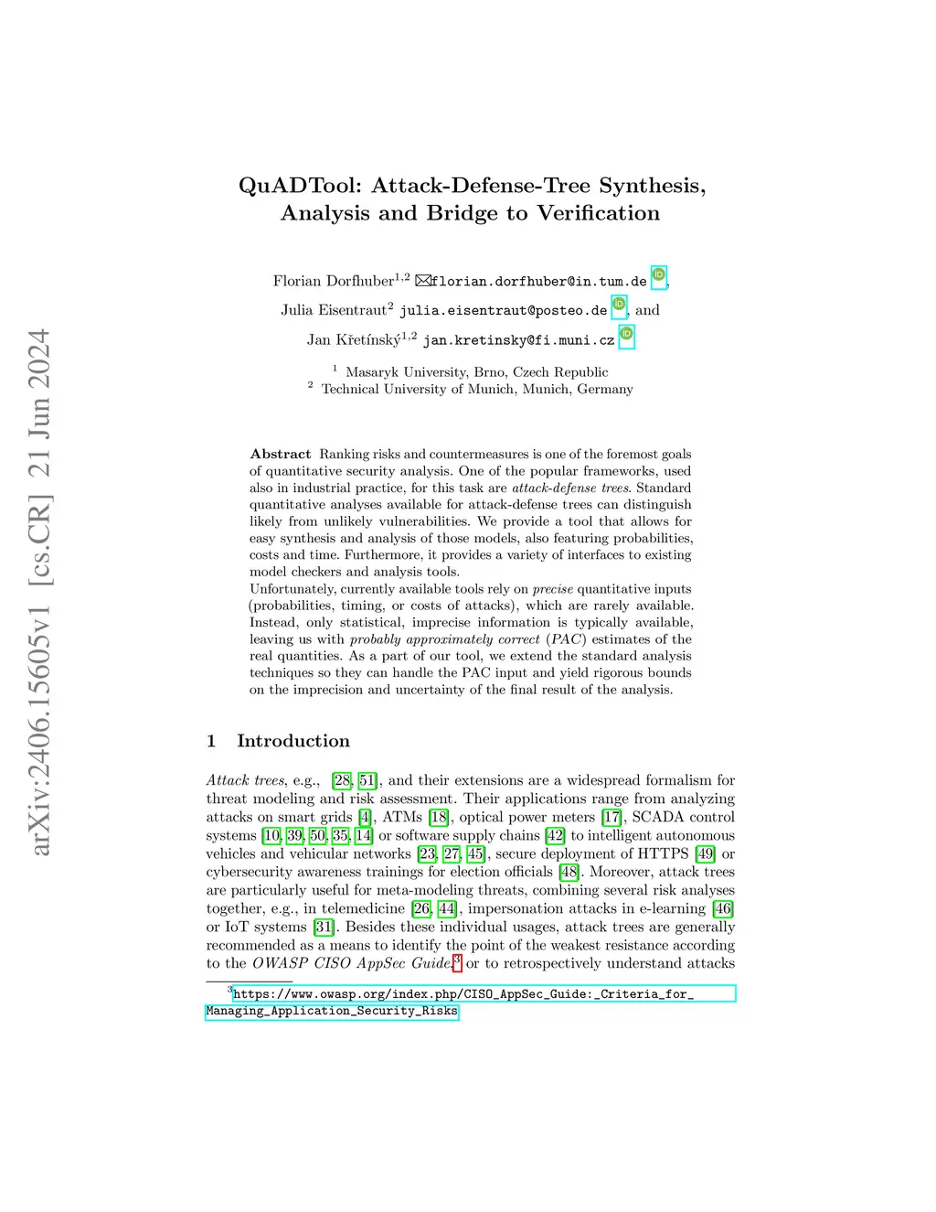 QuADTool: Attack-Defense-Tree Synthesis, Analysis and Bridge to