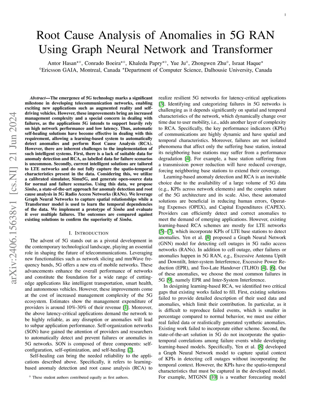 The emergence of 5G technology marks a significant milestone in developing telecommunication networks, enabling exciting new applications such as augmented reality and self-driving vehicles. However, these improvements bring an increased management complexity and a special concern in dealing with failures, as the applications 5G intends to support heavily rely on high network performance and low latency. Thus, automatic self-healing solutions have become effective in dealing with this requirement, allowing a learning-based system to automatically detect anomalies and perform Root Cause Analysis (RCA). However, there are inherent challenges to the implementation of such intelligent systems. First, there is a lack of suitable data for anomaly detection and RCA, as labelled data for failure scenarios is uncommon. Secondly, current intelligent solutions are tailored to LTE networks and do not fully capture the spatio-temporal characteristics present in the data. Considering this, we utilize a calibrated simulator, Simu5G, and generate open-source data for normal and failure scenarios. Using this data, we propose Simba, a state-of-the-art approach for anomaly detection and root cause analysis in 5G Radio Access Networks (RANs). We leverage Graph Neural Networks to capture spatial relationships while a Transformer model is used to learn the temporal dependencies of the data. We implement a prototype of Simba and evaluate it over multiple failures. The outcomes are compared against existing solutions to confirm the superiority of Simba.