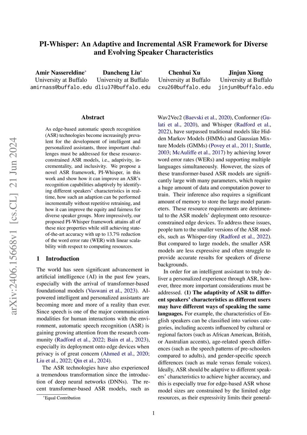 As edge-based automatic speech recognition (ASR) technologies become increasingly prevalent for the development of intelligent and personalized assistants, three important challenges must be addressed for these resource-constrained ASR models, i.e., adaptivity, incrementality, and inclusivity. We propose a novel ASR framework, PI-Whisper, in this work and show how it can improve an ASR's recognition capabilities adaptively by identifying different speakers' characteristics in real-time, how such an adaption can be performed incrementally without repetitive retraining, and how it can improve the equity and fairness for diverse speaker groups. More impressively, our proposed PI-Whisper framework attains all of these nice properties while still achieving state-of-the-art accuracy with up to 13.7% reduction of the word error rate (WER) with linear scalability with respect to computing resources.