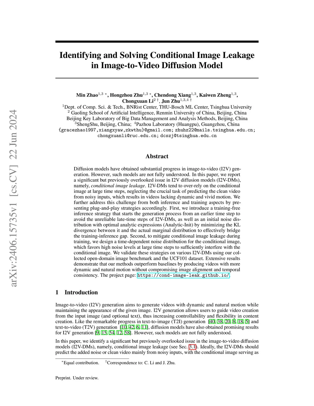 Diffusion models have obtained substantial progress in image-to-video (I2V) generation. However, such models are not fully understood. In this paper, we report a significant but previously overlooked issue in I2V diffusion models (I2V-DMs), namely, conditional image leakage. I2V-DMs tend to over-rely on the conditional image at large time steps, neglecting the crucial task of predicting the clean video from noisy inputs, which results in videos lacking dynamic and vivid motion. We further address this challenge from both inference and training aspects by presenting plug-and-play strategies accordingly. First, we introduce a training-free inference strategy that starts the generation process from an earlier time step to avoid the unreliable late-time steps of I2V-DMs, as well as an initial noise distribution with optimal analytic expressions (Analytic-Init) by minimizing the KL divergence between it and the actual marginal distribution to effectively bridge the training-inference gap. Second, to mitigate conditional image leakage during training, we design a time-dependent noise distribution for the conditional image, which favors high noise levels at large time steps to sufficiently interfere with the conditional image. We validate these strategies on various I2V-DMs using our collected open-domain image benchmark and the UCF101 dataset. Extensive results demonstrate that our methods outperform baselines by producing videos with more dynamic and natural motion without compromising image alignment and temporal consistency. The project page: \url{https://cond-image-leak.github.io/}.