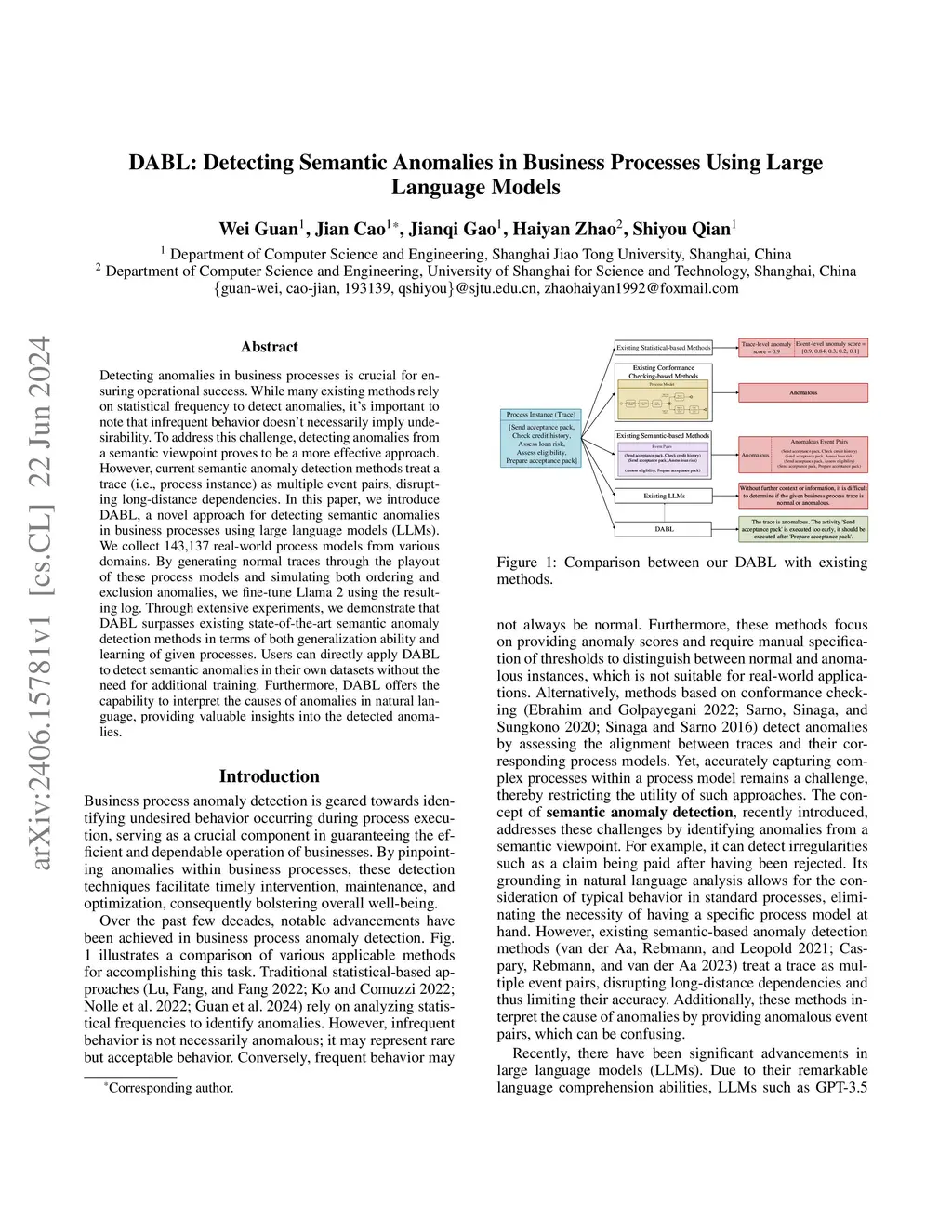 DABL: Detecting Semantic Anomalies in Business Processes Using Large Language Models