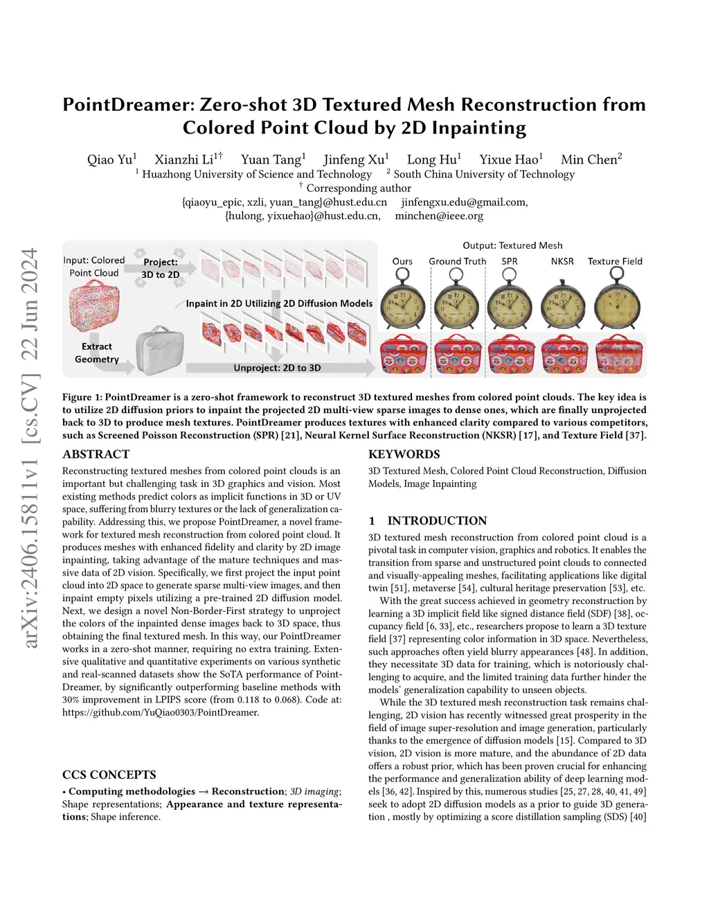 Faithfully reconstructing textured meshes is crucial for many applications. Compared to text or image modalities, leveraging 3D colored point clouds as input (colored-PC-to-mesh) offers inherent advantages in comprehensively and precisely replicating the target object's 360° characteristics. While most existing colored-PC-to-mesh methods suffer from blurry textures or require hard-to-acquire 3D training data, we propose PointDreamer, a novel framework that harnesses 2D diffusion prior for superior texture quality. Crucially, unlike prior 2D-diffusion-for-3D works driven by text or image inputs, PointDreamer successfully adapts 2D diffusion models to 3D point cloud data by a novel project-inpaint-unproject pipeline. Specifically, it first projects the point cloud into sparse 2D images and then performs diffusion-based inpainting. After that, diverging from most existing 3D reconstruction or generation approaches that predict texture in 3D/UV space thus often yielding blurry texture, PointDreamer achieves high-quality texture by directly unprojecting the inpainted 2D images to the 3D mesh. Furthermore, we identify for the first time a typical kind of unprojection artifact appearing in occlusion borders, which is common in other multiview-image-to-3D pipelines but less-explored. To address this, we propose a novel solution named the Non-Border-First (NBF) unprojection strategy. Extensive qualitative and quantitative experiments on various synthetic and real-scanned datasets demonstrate that PointDreamer, though zero-shot, exhibits SoTA performance (30% improvement on LPIPS score from 0.118 to 0.068), and is robust to noisy, sparse, or even incomplete input data. Code at:this https URL.