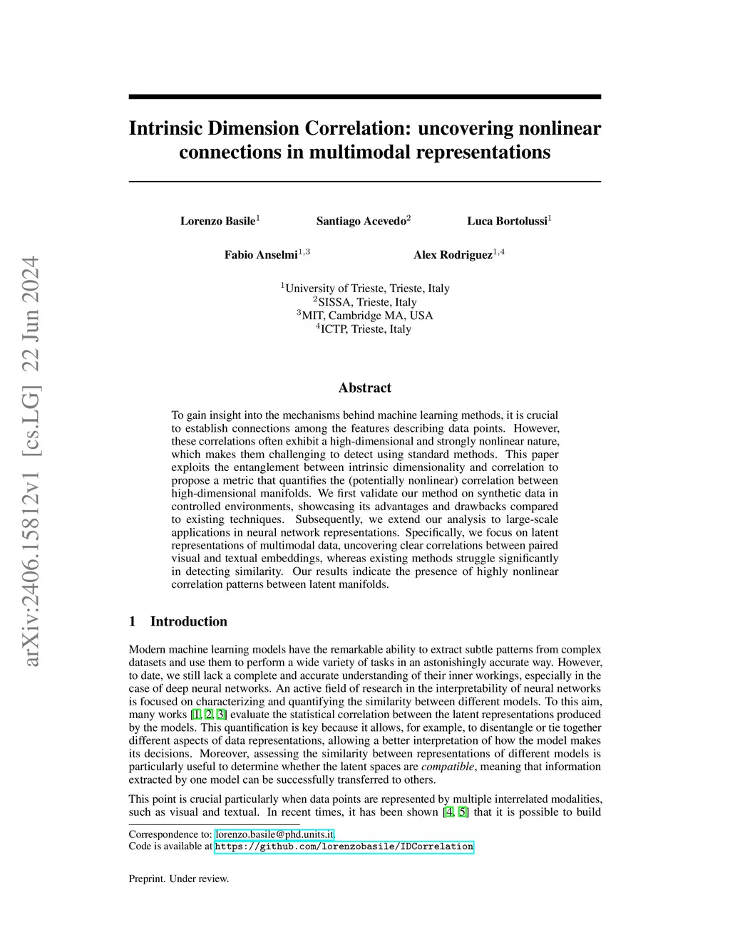 Intrinsic Dimension Correlation: uncovering nonlinear connections in multimodal representations