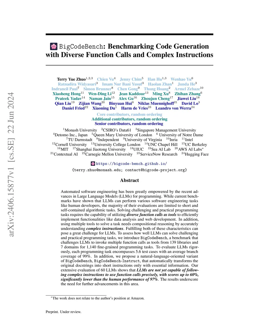 Task automation has been greatly empowered by the recent advances in Large Language Models (LLMs) via Python code, where the tasks ranging from software engineering development to general-purpose reasoning. While current benchmarks have shown that LLMs can solve tasks using programs like human developers, the majority of their evaluations are limited to short and self-contained algorithmic tasks or standalone function calls. Solving challenging and practical tasks requires the capability of utilizing diverse function calls as tools to efficiently implement functionalities like data analysis and web development. In addition, using multiple tools to solve a task needs compositional reasoning by accurately understanding complex instructions. Fulfilling both of these characteristics can pose a great challenge forthis http URLassess how well LLMs can solve challenging and practical tasks via programs, we introduce BigCodeBench, a benchmark that challenges LLMs to invoke multiple function calls as tools from 139 libraries and 7 domains for 1,140 fine-grained tasks. To evaluate LLMs rigorously, each task encompasses 5.6 test cases with an average branch coverage of 99%. In addition, we propose a natural-language-oriented variant of BigCodeBench, BigCodeBench-Instruct, that automatically transforms the original docstrings into short instructions only with essential information. Our extensive evaluation of 60 LLMs shows that LLMs are not yet capable of following complex instructions to use function calls precisely, with scores up to 60%, significantly lower than the human performance of 97%. The results underscore the need for further advancements in this area.
