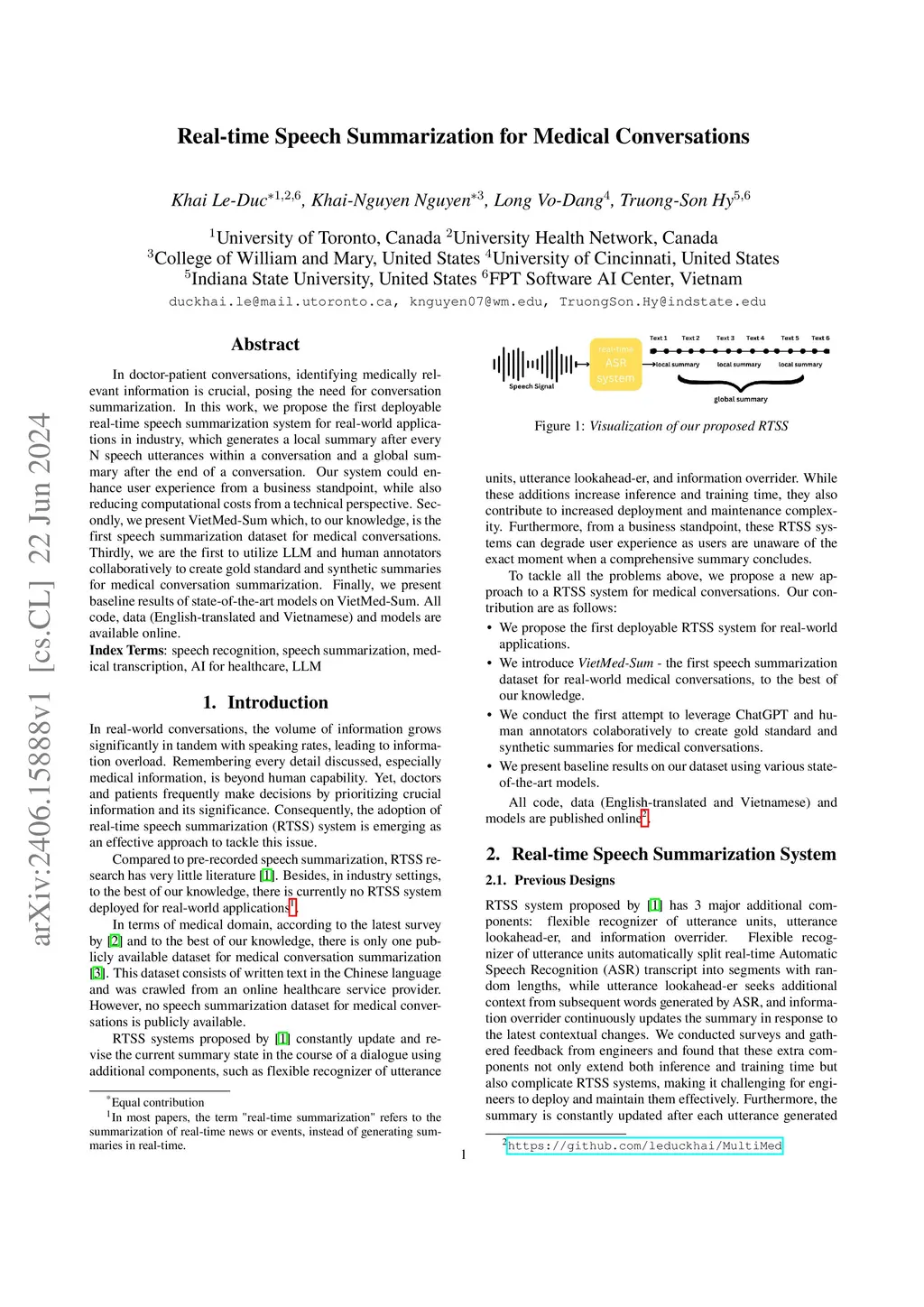 In doctor-patient conversations, identifying medically relevant information is crucial, posing the need for conversation summarization. In this work, we propose the first deployable real-time speech summarization system for real-world applications in industry, which generates a local summary after every N speech utterances within a conversation and a global summary after the end of a conversation. Our system could enhance user experience from a business standpoint, while also reducing computational costs from a technical perspective. Secondly, we present VietMed-Sum which, to our knowledge, is the first speech summarization dataset for medical conversations. Thirdly, we are the first to utilize LLM and human annotators collaboratively to create gold standard and synthetic summaries for medical conversation summarization. Finally, we present baseline results of state-of-the-art models on VietMed-Sum. All code, data (English-translated and Vietnamese) and models are available online:this https URL