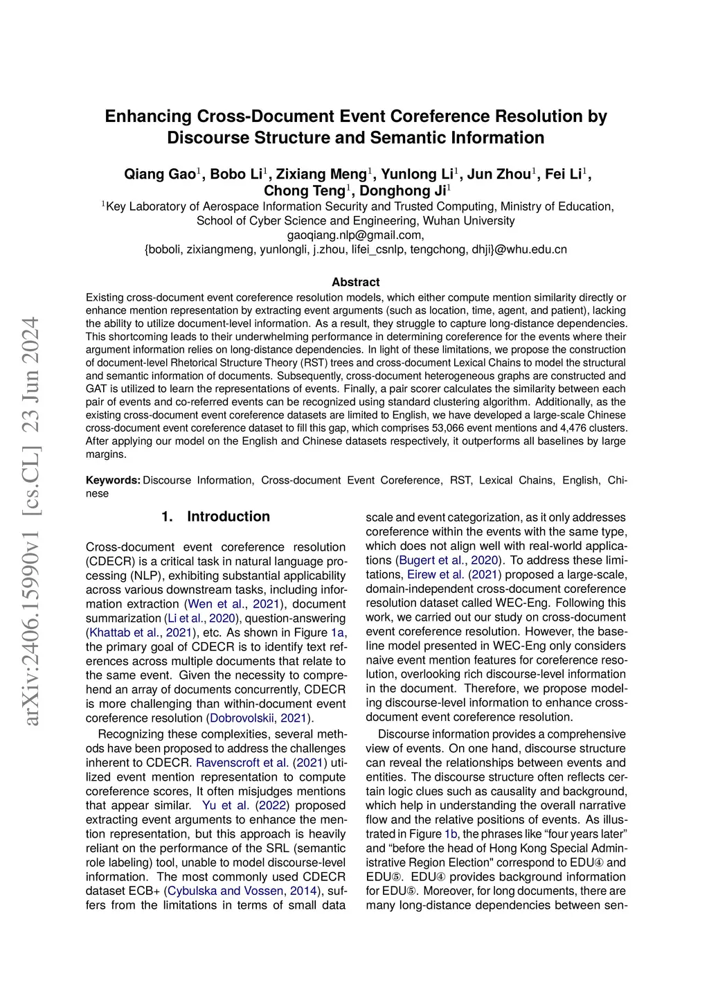 Existing cross-document event coreference resolution models, which either compute mention similarity directly or enhance mention representation by extracting event arguments (such as location, time, agent, and patient), lacking the ability to utilize document-level information. As a result, they struggle to capture long-distance dependencies. This shortcoming leads to their underwhelming performance in determining coreference for the events where their argument information relies on long-distance dependencies. In light of these limitations, we propose the construction of document-level Rhetorical Structure Theory (RST) trees and cross-document Lexical Chains to model the structural and semantic information of documents. Subsequently, cross-document heterogeneous graphs are constructed and GAT is utilized to learn the representations of events. Finally, a pair scorer calculates the similarity between each pair of events and co-referred events can be recognized using standard clustering algorithm. Additionally, as the existing cross-document event coreference datasets are limited to English, we have developed a large-scale Chinese cross-document event coreference dataset to fill this gap, which comprises 53,066 event mentions and 4,476 clusters. After applying our model on the English and Chinese datasets respectively, it outperforms all baselines by large margins.