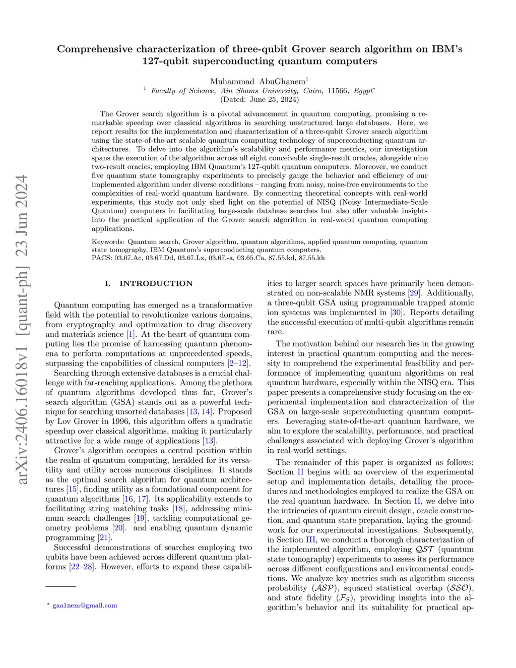 The Grover search algorithm is a pivotal advancement in quantum computing, promising a remarkable speedup over classical algorithms in searching unstructured large databases. Here, we report results for the implementation and characterization of a three-qubit Grover search algorithm using the state-of-the-art scalable quantum computing technology of superconducting quantum architectures. To delve into the algorithm's scalability and performance metrics, our investigation spans the execution of the algorithm across all eight conceivable single-result oracles, alongside nine two-result oracles, employing IBM Quantum's 127-qubit quantum computers. Moreover, we conduct five quantum state tomography experiments to precisely gauge the behavior and efficiency of our implemented algorithm under diverse conditions; ranging from noisy, noise-free environments to the complexities of real-world quantum hardware. By connecting theoretical concepts with real-world experiments, this study not only shed light on the potential of NISQ (Noisy Intermediate-Scale Quantum) computers in facilitating large-scale database searches but also offer valuable insights into the practical application of the Grover search algorithm in real-world quantum computing applications.