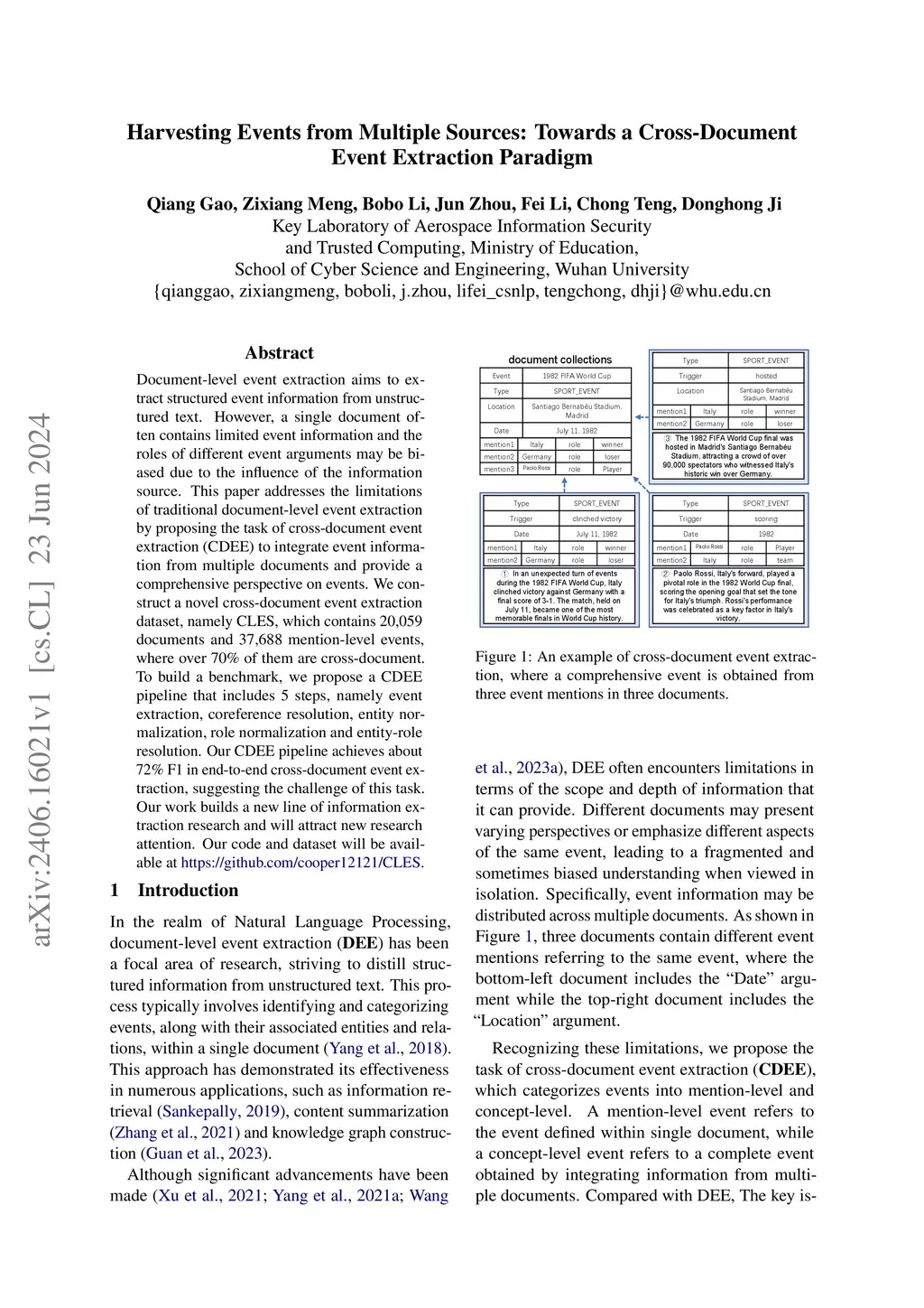 Document-level event extraction aims to extract structured event information from unstructured text. However, a single document often contains limited event information and the roles of different event arguments may be biased due to the influence of the information source. This paper addresses the limitations of traditional document-level event extraction by proposing the task of cross-document event extraction (CDEE) to integrate event information from multiple documents and provide a comprehensive perspective on events. We construct a novel cross-document event extraction dataset, namely CLES, which contains 20,059 documents and 37,688 mention-level events, where over 70% of them are cross-document. To build a benchmark, we propose a CDEE pipeline that includes 5 steps, namely event extraction, coreference resolution, entity normalization, role normalization and entity-role resolution. Our CDEE pipeline achieves about 72% F1 in end-to-end cross-document event extraction, suggesting the challenge of this task. Our work builds a new line of information extraction research and will attract new research attention.