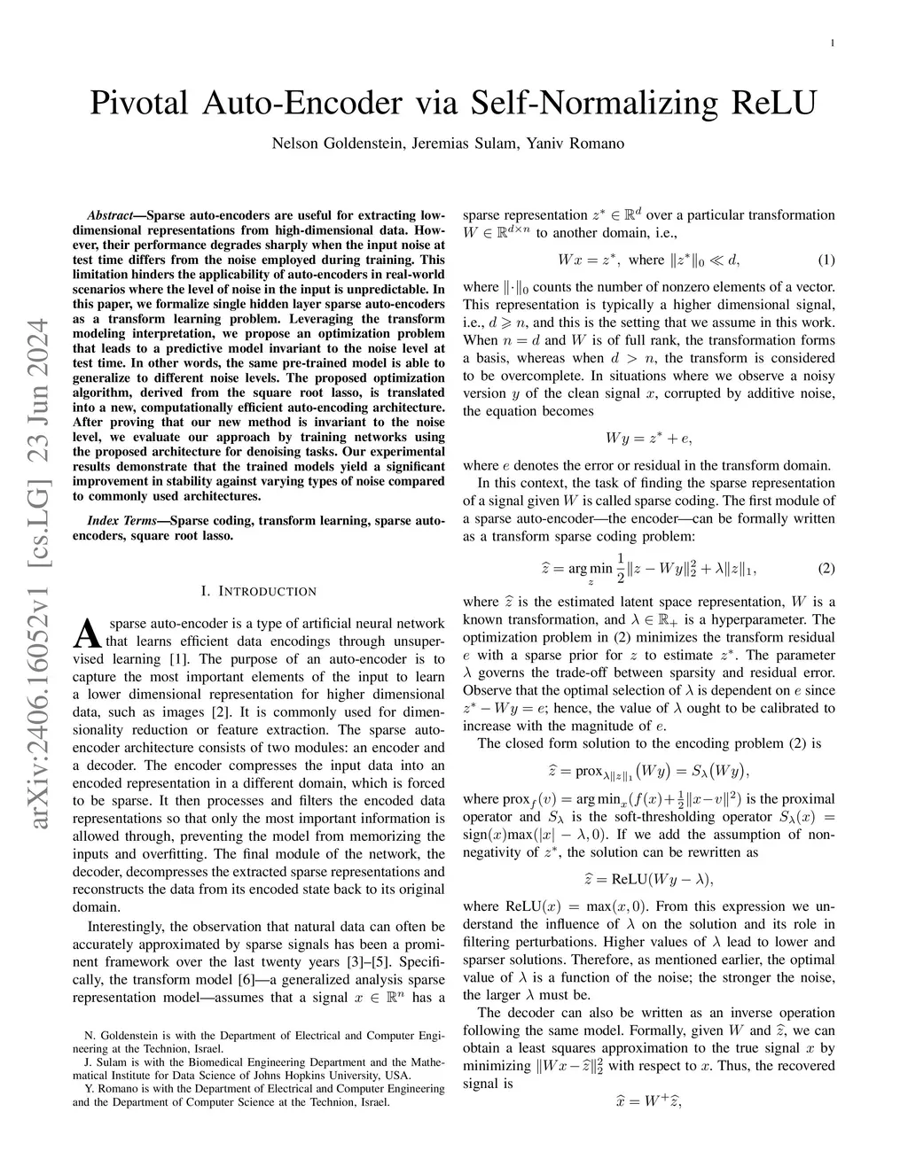 Sparse auto-encoders are useful for extracting low-dimensional representations from high-dimensional data. However, their performance degrades sharply when the input noise at test time differs from the noise employed during training. This limitation hinders the applicability of auto-encoders in real-world scenarios where the level of noise in the input is unpredictable. In this paper, we formalize single hidden layer sparse auto-encoders as a transform learning problem. Leveraging the transform modeling interpretation, we propose an optimization problem that leads to a predictive model invariant to the noise level at test time. In other words, the same pre-trained model is able to generalize to different noise levels. The proposed optimization algorithm, derived from the square root lasso, is translated into a new, computationally efficient auto-encoding architecture. After proving that our new method is invariant to the noise level, we evaluate our approach by training networks using the proposed architecture for denoising tasks. Our experimental results demonstrate that the trained models yield a significant improvement in stability against varying types of noise compared to commonly used architectures.