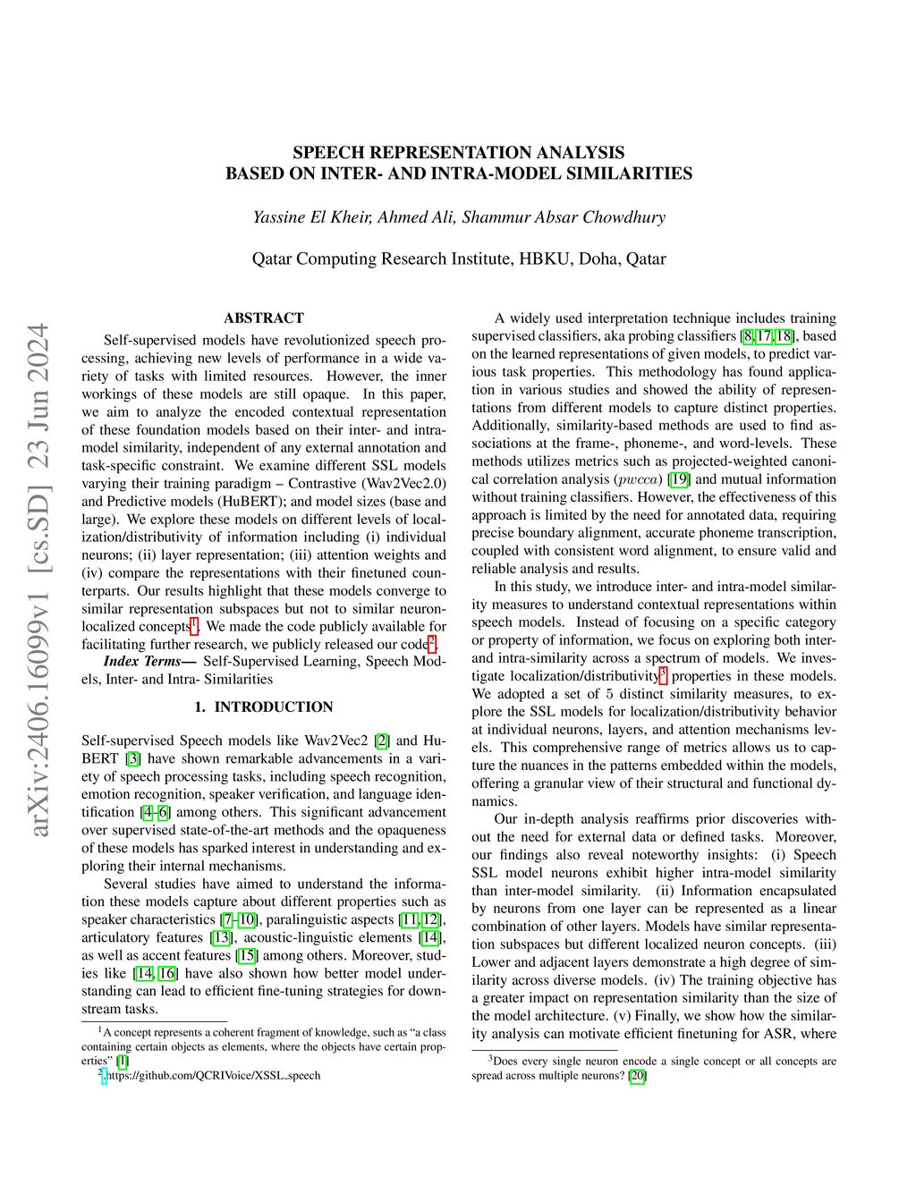 Self-supervised models have revolutionized speech processing, achieving new levels of performance in a wide variety of tasks with limited resources. However, the inner workings of these models are still opaque. In this paper, we aim to analyze the encoded contextual representation of these foundation models based on their inter- and intra-model similarity, independent of any external annotation and task-specific constraint. We examine different SSL models varying their training paradigm -- Contrastive (Wav2Vec2.0) and Predictive models (HuBERT); and model sizes (base and large). We explore these models on different levels of localization/distributivity of information including (i) individual neurons; (ii) layer representation; (iii) attention weights and (iv) compare the representations with their finetuned counterparts.Our results highlight that these models converge to similar representation subspaces but not to similar neuron-localized concepts\footnote{A concept represents a coherent fragment of knowledge, such as ``a class containing certain objects as elements, where the objects have certain properties. We made the code publicly available for facilitating further research, we publicly released our code.