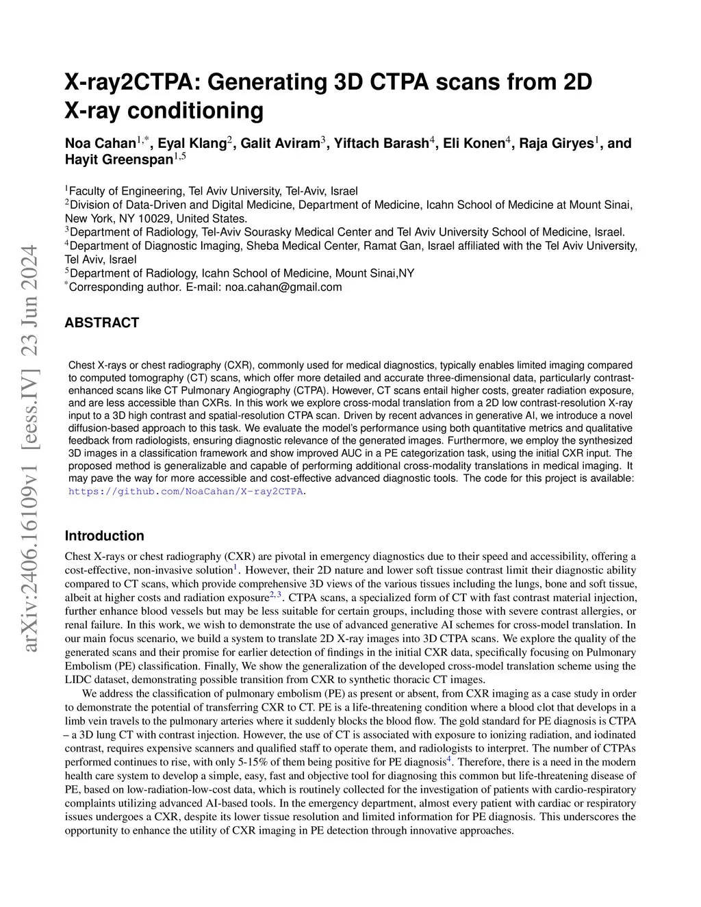 Chest X-rays or chest radiography (CXR), commonly used for medical diagnostics, typically enables limited imaging compared to computed tomography (CT) scans, which offer more detailed and accurate three-dimensional data, particularly contrast-enhanced scans like CT Pulmonary Angiography (CTPA). However, CT scans entail higher costs, greater radiation exposure, and are less accessible than CXRs. In this work we explore cross-modal translation from a 2D low contrast-resolution X-ray input to a 3D high contrast and spatial-resolution CTPA scan. Driven by recent advances in generative AI, we introduce a novel diffusion-based approach to this task. We evaluate the models performance using both quantitative metrics and qualitative feedback from radiologists, ensuring diagnostic relevance of the generated images. Furthermore, we employ the synthesized 3D images in a classification framework and show improved AUC in a PE categorization task, using the initial CXR input. The proposed method is generalizable and capable of performing additional cross-modality translations in medical imaging. It may pave the way for more accessible and cost-effective advanced diagnostic tools. The code for this project is available:this https URL.