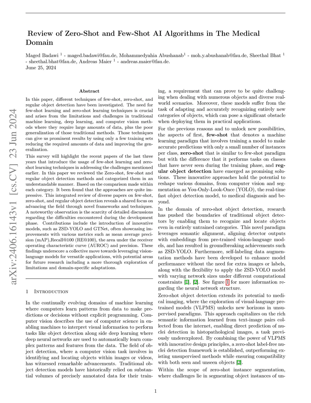 In this paper, different techniques of few-shot, zero-shot, and regular object detection have been investigated. The need for few-shot learning and zero-shot learning techniques is crucial and arises from the limitations and challenges in traditional machine learning, deep learning, and computer vision methods where they require large amounts of data, plus the poor generalization of those traditional methods. Those techniques can give us prominent results by using only a few training sets reducing the required amounts of data and improving the generalization. This survey will highlight the recent papers of the last three years that introduce the usage of few-shot learning and zero-shot learning techniques in addressing the challenges mentioned earlier. In this paper we reviewed the Zero-shot, few-shot and regular object detection methods and categorized them in an understandable manner. Based on the comparison made within each category. It been found that the approaches are quite impressive. This integrated review of diverse papers on few-shot, zero-shot, and regular object detection reveals a shared focus on advancing the field through novel frameworks and techniques. A noteworthy observation is the scarcity of detailed discussions regarding the difficulties encountered during the development phase. Contributions include the introduction of innovative models, such as ZSD-YOLO and GTNet, often showcasing improvements with various metrics such as mean average precision (mAP),Recall@100 (RE@100), the area under the receiver operating characteristic curve (AUROC) and precision. These findings underscore a collective move towards leveraging vision-language models for versatile applications, with potential areas for future research including a more thorough exploration of limitations and domain-specific adaptations.