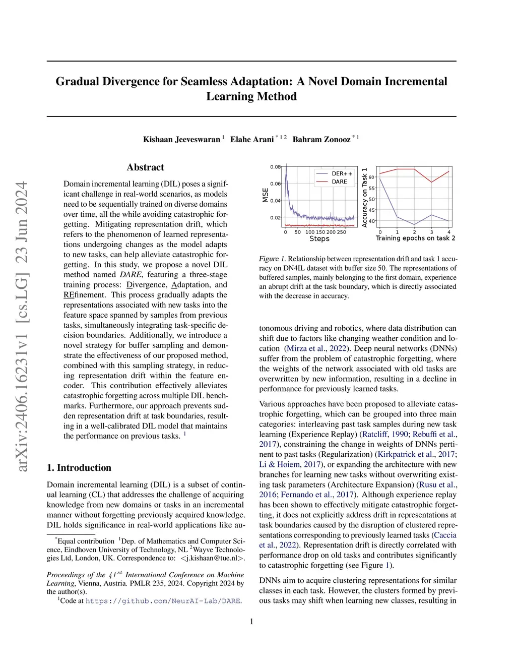 Domain incremental learning (DIL) poses a significant challenge in real-world scenarios, as models need to be sequentially trained on diverse domains over time, all the while avoiding catastrophic forgetting. Mitigating representation drift, which refers to the phenomenon of learned representations undergoing changes as the model adapts to new tasks, can help alleviate catastrophic forgetting. In this study, we propose a novel DIL method named DARE, featuring a three-stage training process: Divergence, Adaptation, and REfinement. This process gradually adapts the representations associated with new tasks into the feature space spanned by samples from previous tasks, simultaneously integrating task-specific decision boundaries. Additionally, we introduce a novel strategy for buffer sampling and demonstrate the effectiveness of our proposed method, combined with this sampling strategy, in reducing representation drift within the feature encoder. This contribution effectively alleviates catastrophic forgetting across multiple DIL benchmarks. Furthermore, our approach prevents sudden representation drift at task boundaries, resulting in a well-calibrated DIL model that maintains the performance on previous tasks.