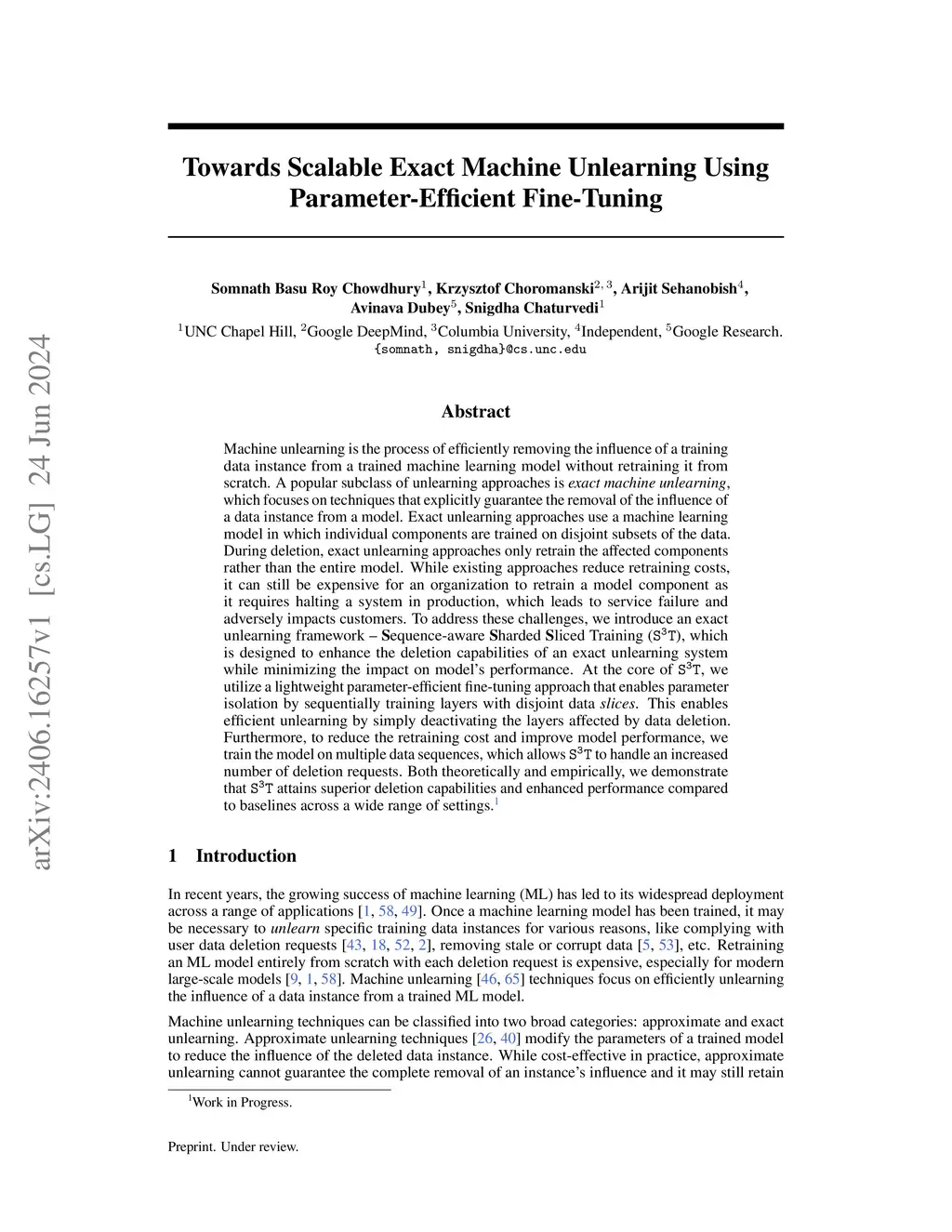 Machine unlearning is the process of efficiently removing the influence of a training data instance from a trained machine learning model without retraining it from scratch. A popular subclass of unlearning approaches is exact machine unlearning, which focuses on techniques that explicitly guarantee the removal of the influence of a data instance from a model. Exact unlearning approaches use a machine learning model in which individual components are trained on disjoint subsets of the data. During deletion, exact unlearning approaches only retrain the affected components rather than the entire model. While existing approaches reduce retraining costs, it can still be expensive for an organization to retrain a model component as it requires halting a system in production, which leads to service failure and adversely impacts customers. To address these challenges, we introduce an exact unlearning framework -- Sequence-aware Sharded Sliced Training (S3T), which is designed to enhance the deletion capabilities of an exact unlearning system while minimizing the impact on model's performance. At the core of S3T, we utilize a lightweight parameter-efficient fine-tuning approach that enables parameter isolation by sequentially training layers with disjoint data slices. This enables efficient unlearning by simply deactivating the layers affected by data deletion. Furthermore, to reduce the retraining cost and improve model performance, we train the model on multiple data sequences, which allows S3T to handle an increased number of deletion requests. Both theoretically and empirically, we demonstrate that S3T attains superior deletion capabilities and enhanced performance compared to baselines across a wide range of settings.