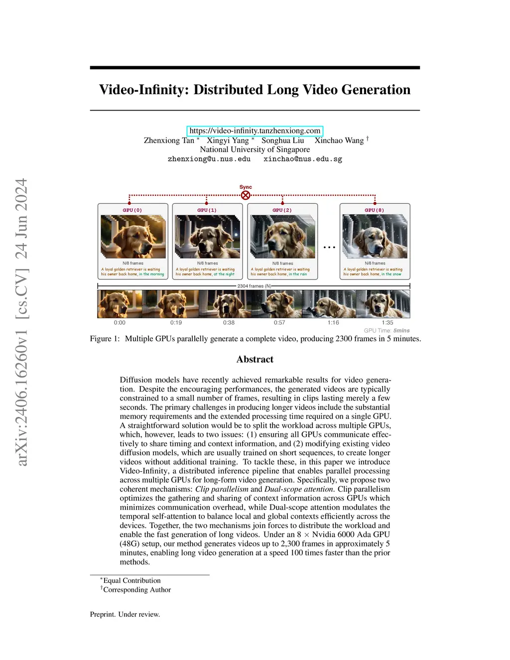 Diffusion models have recently achieved remarkable results for video generation. Despite the encouraging performances, the generated videos are typically constrained to a small number of frames, resulting in clips lasting merely a few seconds. The primary challenges in producing longer videos include the substantial memory requirements and the extended processing time required on a single GPU. A straightforward solution would be to split the workload across multiple GPUs, which, however, leads to two issues: (1) ensuring all GPUs communicate effectively to share timing and context information, and (2) modifying existing video diffusion models, which are usually trained on short sequences, to create longer videos without additional training. To tackle these, in this paper we introduce Video-Infinity, a distributed inference pipeline that enables parallel processing across multiple GPUs for long-form video generation. Specifically, we propose two coherent mechanisms: Clip parallelism and Dual-scope attention. Clip parallelism optimizes the gathering and sharing of context information across GPUs which minimizes communication overhead, while Dual-scope attention modulates the temporal self-attention to balance local and global contexts efficiently across the devices. Together, the two mechanisms join forces to distribute the workload and enable the fast generation of long videos. Under an 8 x Nvidia 6000 Ada GPU (48G) setup, our method generates videos up to 2,300 frames in approximately 5 minutes, enabling long video generation at a speed 100 times faster than the prior methods.