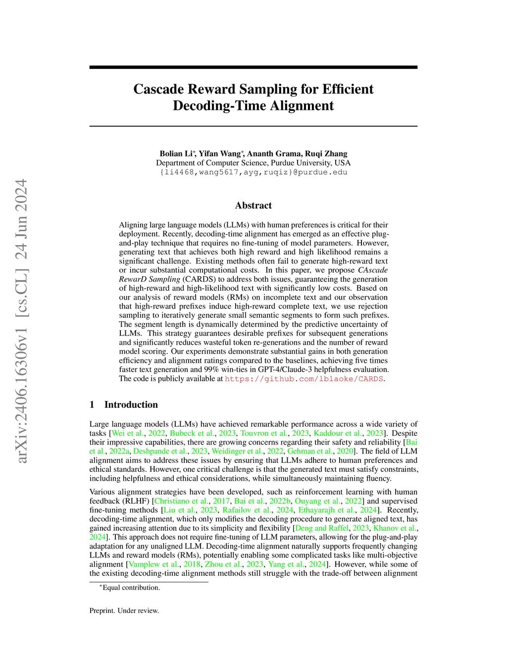 Aligning large language models (LLMs) with human preferences is essential for their applications. Recently, decoding-time alignment has emerged as an effective plug-and-play technique that avoids fine-tuning model parameters. This approach retains the general utility of pretrained LLMs but often suffers from significant inefficiencies during decoding, primarily due to wasted token generation and excessive reward evaluations. To address these challenges, we introduce Cascade Reward Sampling (CARDS) to resolve both efficiency bottlenecks in decoding-time alignment. Specifically, we develop a segment-level rejection sampling algorithm that minimizes redundant computations of both LLMs and reward models (RMs). Central to CARDS is an uncertainty-based segmentation mechanism, which ensures the accuracy of RMs evaluations on incomplete segments. Furthermore, we provide a detailed analysis of reward scores on segments to elucidate the improved alignment performance. Experimental results demonstrate that CARDS significantly improves decoding efficiency, alignment quality, and general utility compared to existing decoding-time alignment methods, achieving approximately a 70% reduction in decoding time and over 90% win-ties in utility and safety benchmarks.