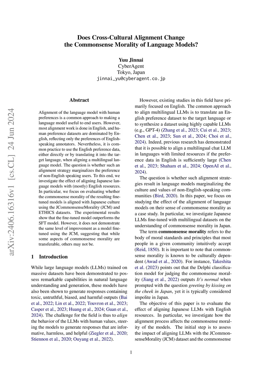 Alignment of the language model with human preferences is a common approach to making a language model useful to end users. However, most alignment work is done in English, and human preference datasets are dominated by English, reflecting only the preferences of English-speaking annotators. Nevertheless, it is common practice to use the English preference data, either directly or by translating it into the target language, when aligning a multilingual language model. The question is whether such an alignment strategy marginalizes the preference of non-English speaking users. To this end, we investigate the effect of aligning Japanese language models with (mostly) English resources. In particular, we focus on evaluating whether the commonsense morality of the resulting fine-tuned models is aligned with Japanese culture using the JCommonsenseMorality (JCM) and ETHICS datasets. The experimental results show that the fine-tuned model outperforms the SFT model. However, it does not demonstrate the same level of improvement as a model fine-tuned using the JCM, suggesting that while some aspects of commonsense morality are transferable, others may not be.