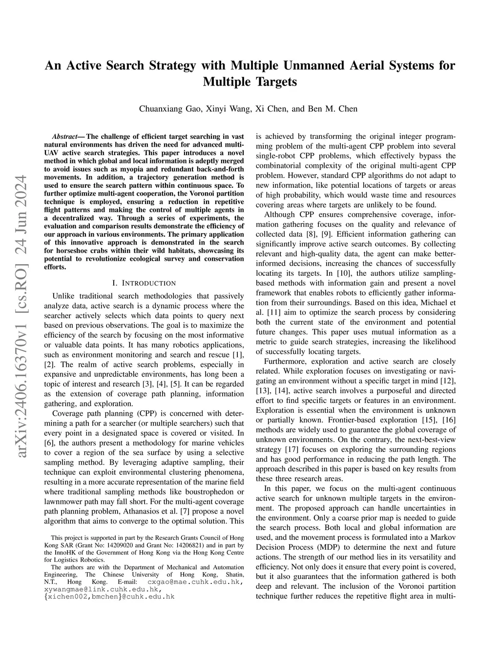 The challenge of efficient target searching in vast natural environments has driven the need for advanced multi-UAV active search strategies. This paper introduces a novel method in which global and local information is adeptly merged to avoid issues such as myopia and redundant back-and-forth movements. In addition, a trajectory generation method is used to ensure the search pattern within continuous space. To further optimize multi-agent cooperation, the Voronoi partition technique is employed, ensuring a reduction in repetitive flight patterns and making the control of multiple agents in a decentralized way. Through a series of experiments, the evaluation and comparison results demonstrate the efficiency of our approach in various environments. The primary application of this innovative approach is demonstrated in the search for horseshoe crabs within their wild habitats, showcasing its potential to revolutionize ecological survey and conservation efforts.