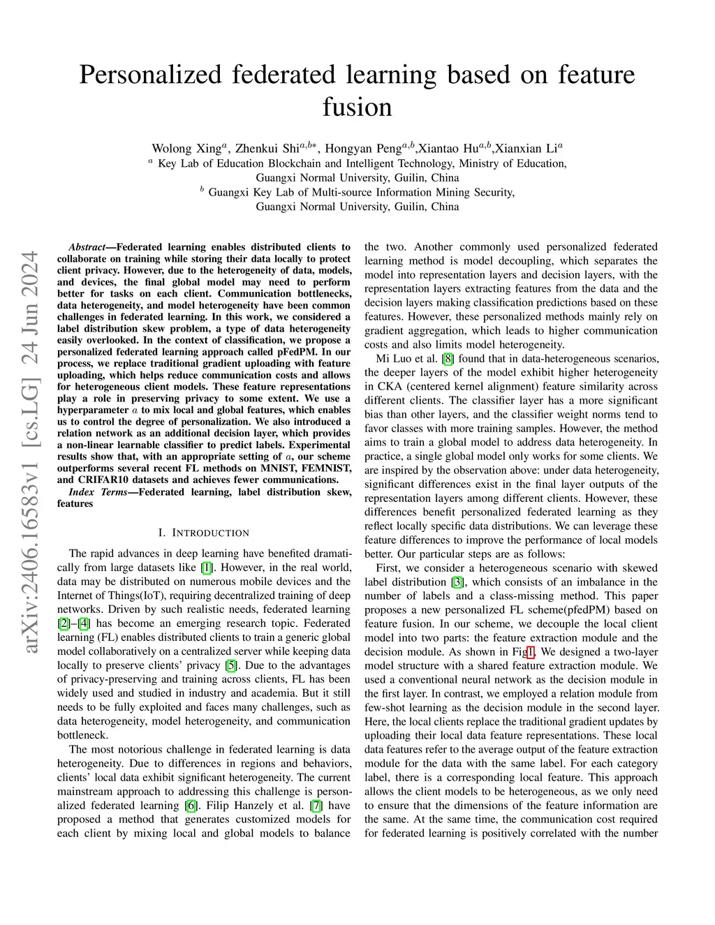 Personalized federated learning based on feature fusion
