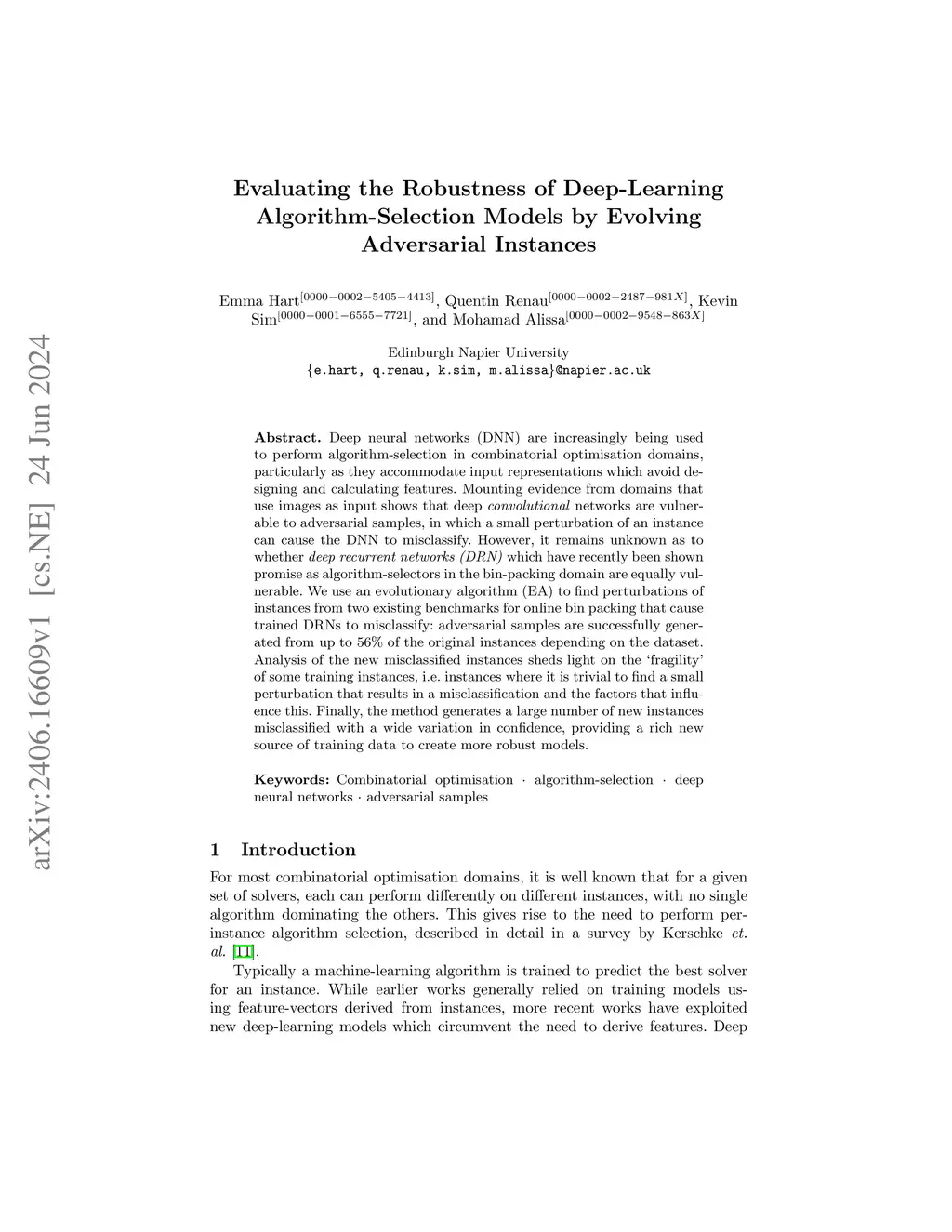 Deep neural networks (DNN) are increasingly being used to perform algorithm-selection in combinatorial optimisation domains, particularly as they accommodate input representations which avoid designing and calculating features. Mounting evidence from domains that use images as input shows that deep convolutional networks are vulnerable to adversarial samples, in which a small perturbation of an instance can cause the DNN to misclassify. However, it remains unknown as to whether deep recurrent networks (DRN) which have recently been shown promise as algorithm-selectors in the bin-packing domain are equally vulnerable. We use an evolutionary algorithm (EA) to find perturbations of instances from two existing benchmarks for online bin packing that cause trained DRNs to misclassify: adversarial samples are successfully generated from up to 56% of the original instances depending on the dataset. Analysis of the new misclassified instances sheds light on the `fragility' of some training instances, i.e. instances where it is trivial to find a small perturbation that results in a misclassification and the factors that influence this. Finally, the method generates a large number of new instances misclassified with a wide variation in confidence, providing a rich new source of training data to create more robust models.