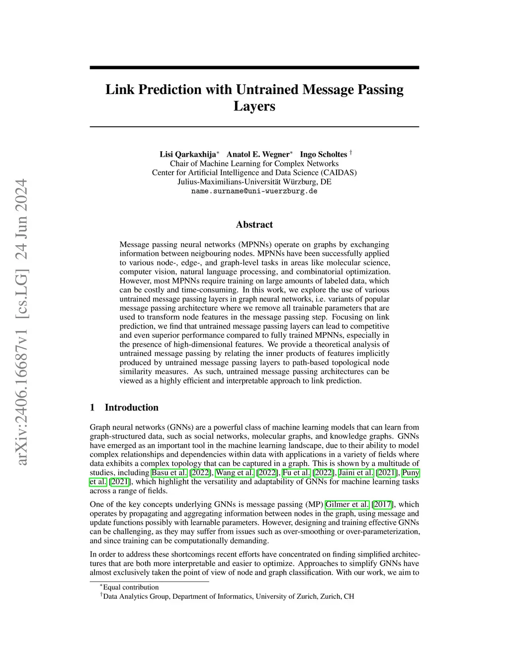 Message passing neural networks (MPNNs) operate on graphs by exchanging information between neigbouring nodes. MPNNs have been successfully applied to various node-, edge-, and graph-level tasks in areas like molecular science, computer vision, natural language processing, and combinatorial optimization. However, most MPNNs require training on large amounts of labeled data, which can be costly and time-consuming. In this work, we explore the use of various untrained message passing layers in graph neural networks, i.e. variants of popular message passing architecture where we remove all trainable parameters that are used to transform node features in the message passing step. Focusing on link prediction, we find that untrained message passing layers can lead to competitive and even superior performance compared to fully trained MPNNs, especially in the presence of high-dimensional features. We provide a theoretical analysis of untrained message passing by relating the inner products of features implicitly produced by untrained message passing layers to path-based topological node similarity measures. As such, untrained message passing architectures can be viewed as a highly efficient and interpretable approach to link prediction.