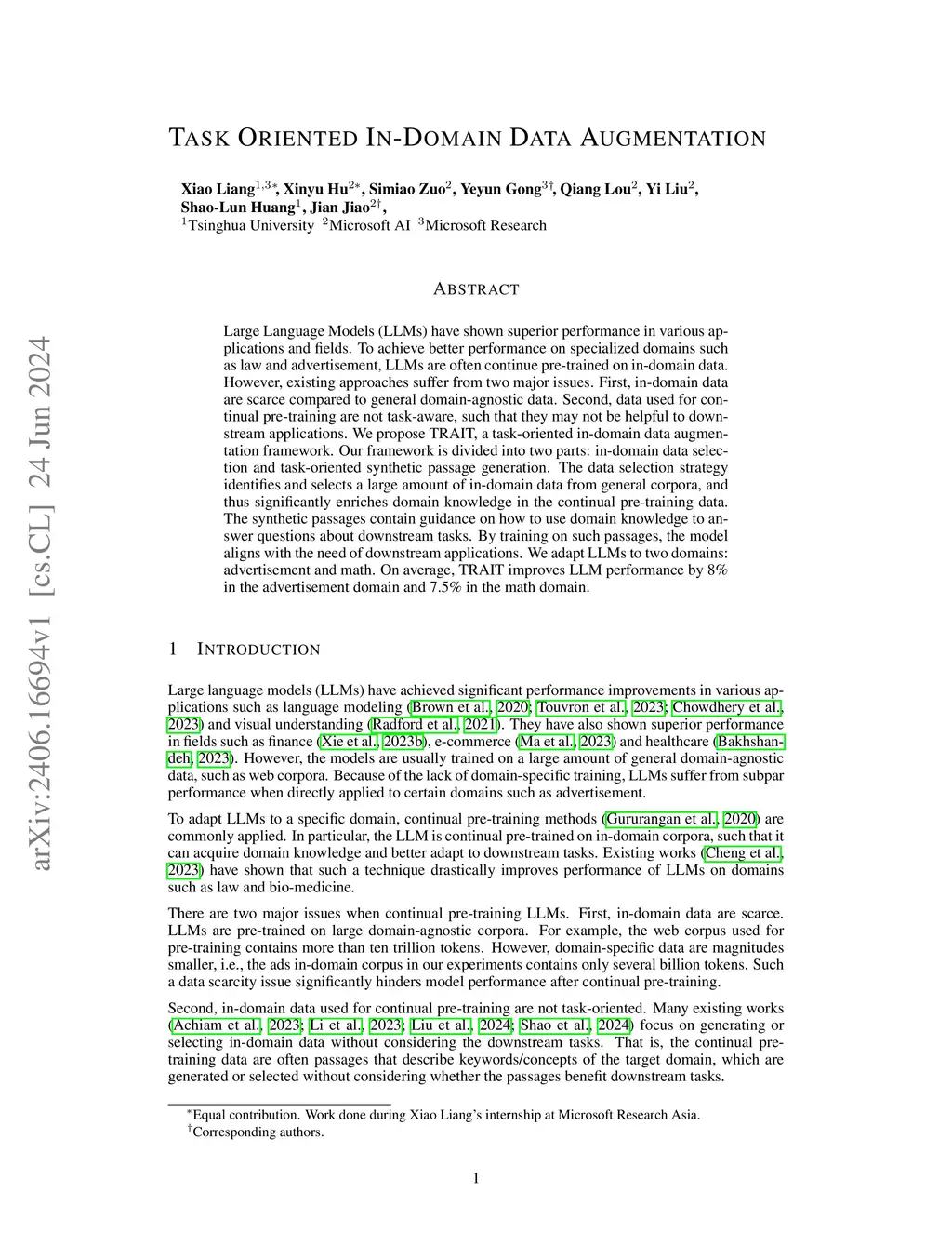 Large Language Models (LLMs) have shown superior performance in various applications and fields. To achieve better performance on specialized domains such as law and advertisement, LLMs are often continue pre-trained on in-domain data. However, existing approaches suffer from two major issues. First, in-domain data are scarce compared with general domain-agnostic data. Second, data used for continual pre-training are not task-aware, such that they may not be helpful to downstream applications. We propose TRAIT, a task-oriented in-domain data augmentation framework. Our framework is divided into two parts: in-domain data selection and task-oriented synthetic passage generation. The data selection strategy identifies and selects a large amount of in-domain data from general corpora, and thus significantly enriches domain knowledge in the continual pre-training data. The synthetic passages contain guidance on how to use domain knowledge to answer questions about downstream tasks. By training on such passages, the model aligns with the need of downstream applications. We adapt LLMs to two domains: advertisement and math. On average, TRAIT improves LLM performance by 8% in the advertisement domain and 7.5% in the math domain.