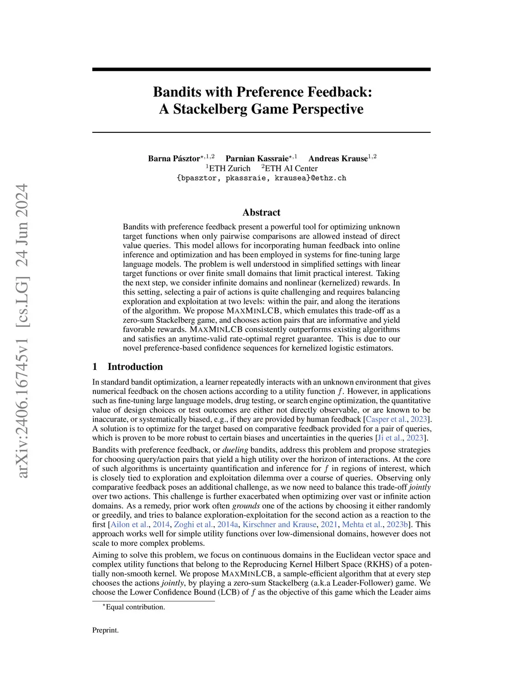 Bandits with preference feedback present a powerful tool for optimizing unknown target functions when only pairwise comparisons are allowed instead of direct value queries. This model allows for incorporating human feedback into online inference and optimization and has been employed in systems for fine-tuning large language models. The problem is well understood in simplified settings with linear target functions or over finite small domains that limit practical interest. Taking the next step, we consider infinite domains and nonlinear (kernelized) rewards. In this setting, selecting a pair of actions is quite challenging and requires balancing exploration and exploitation at two levels: within the pair, and along the iterations of the algorithm. We propose MAXMINLCB, which emulates this trade-off as a zero-sum Stackelberg game, and chooses action pairs that are informative and yield favorable rewards. MAXMINLCB consistently outperforms existing algorithms and satisfies an anytime-valid rate-optimal regret guarantee. This is due to our novel preference-based confidence sequences for kernelized logistic estimators.