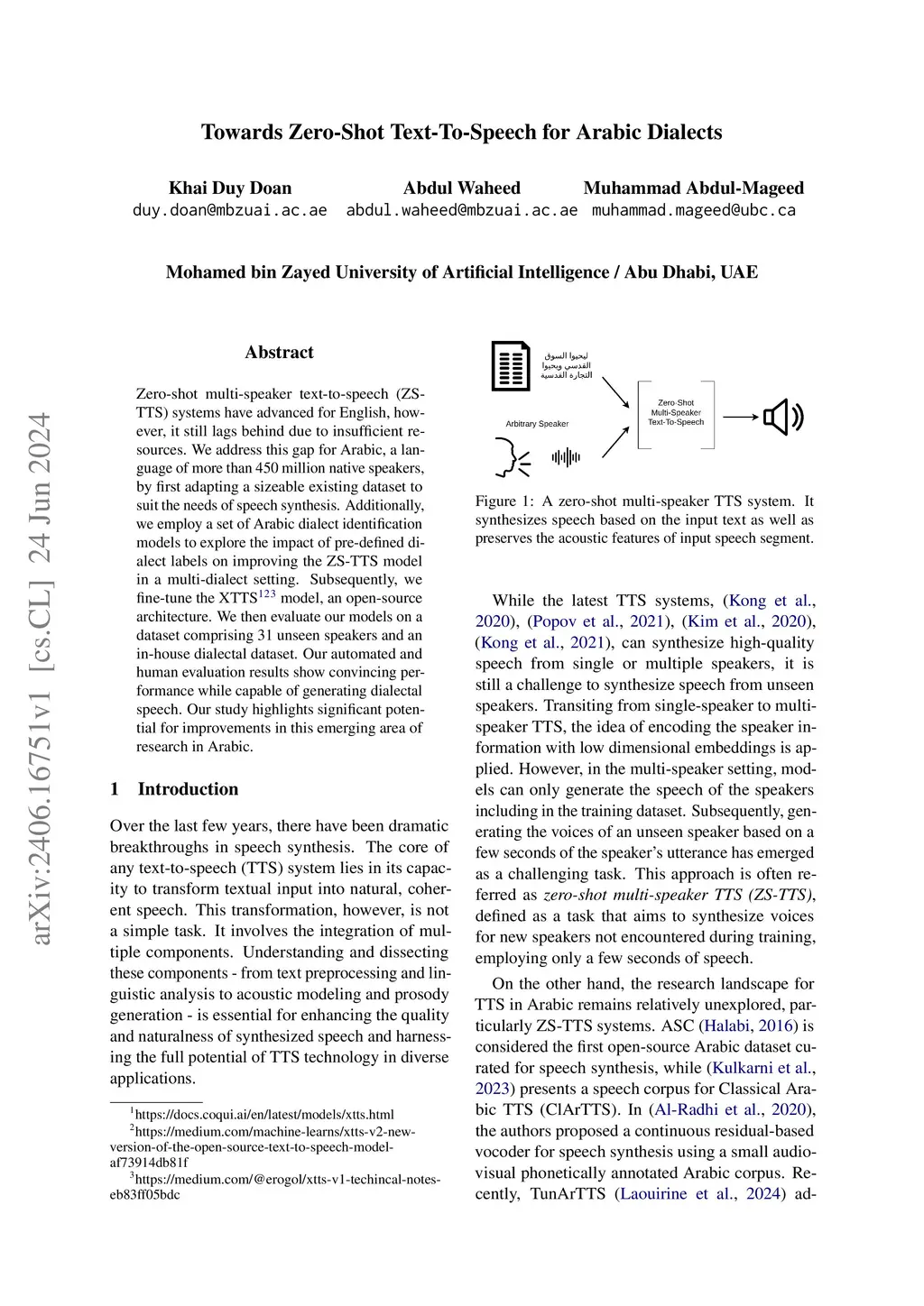 Zero-shot multi-speaker text-to-speech (ZS-TTS) systems have advanced for English, however, it still lags behind due to insufficient resources. We address this gap for Arabic, a language of more than 450 million native speakers, by first adapting a sizeable existing dataset to suit the needs of speech synthesis. Additionally, we employ a set of Arabic dialect identification models to explore the impact of pre-defined dialect labels on improving the ZS-TTS model in a multi-dialect setting. Subsequently, we fine-tune the XTTS\footnote{https://docs.coqui.ai/en/latest/models/xtts.html}\footnote{https://medium.com/machine-learns/xtts-v2-new-version-of-the-open-source-text-to-speech-model-af73914db81f}\footnote{https://medium.com/@erogol/xtts-v1-techincal-notes-eb83ff05bdc} model, an open-source architecture. We then evaluate our models on a dataset comprising 31 unseen speakers and an in-house dialectal dataset. Our automated and human evaluation results show convincing performance while capable of generating dialectal speech. Our study highlights significant potential for improvements in this emerging area of research in Arabic.