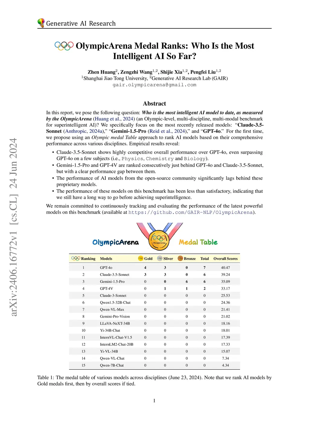 In this report, we pose the following question: Who is the most intelligent AI model to date, as measured by the OlympicArena (an Olympic-level, multi-discipline, multi-modal benchmark for superintelligent AI)? We specifically focus on the most recently released models: Claude-3.5-Sonnet, Gemini-1.5-Pro, and GPT-4o. For the first time, we propose using an Olympic medal Table approach to rank AI models based on their comprehensive performance across various disciplines. Empirical results reveal: (1) Claude-3.5-Sonnet shows highly competitive overall performance over GPT-4o, even surpassing GPT-4o on a few subjects (i.e., Physics, Chemistry, and Biology). (2) Gemini-1.5-Pro and GPT-4V are ranked consecutively just behind GPT-4o and Claude-3.5-Sonnet, but with a clear performance gap between them. (3) The performance of AI models from the open-source community significantly lags behind these proprietary models. (4) The performance of these models on this benchmark has been less than satisfactory, indicating that we still have a long way to go before achieving superintelligence. We remain committed to continuously tracking and evaluating the performance of the latest powerful models on this benchmark (available at https://github.com/GAIR-NLP/OlympicArena).