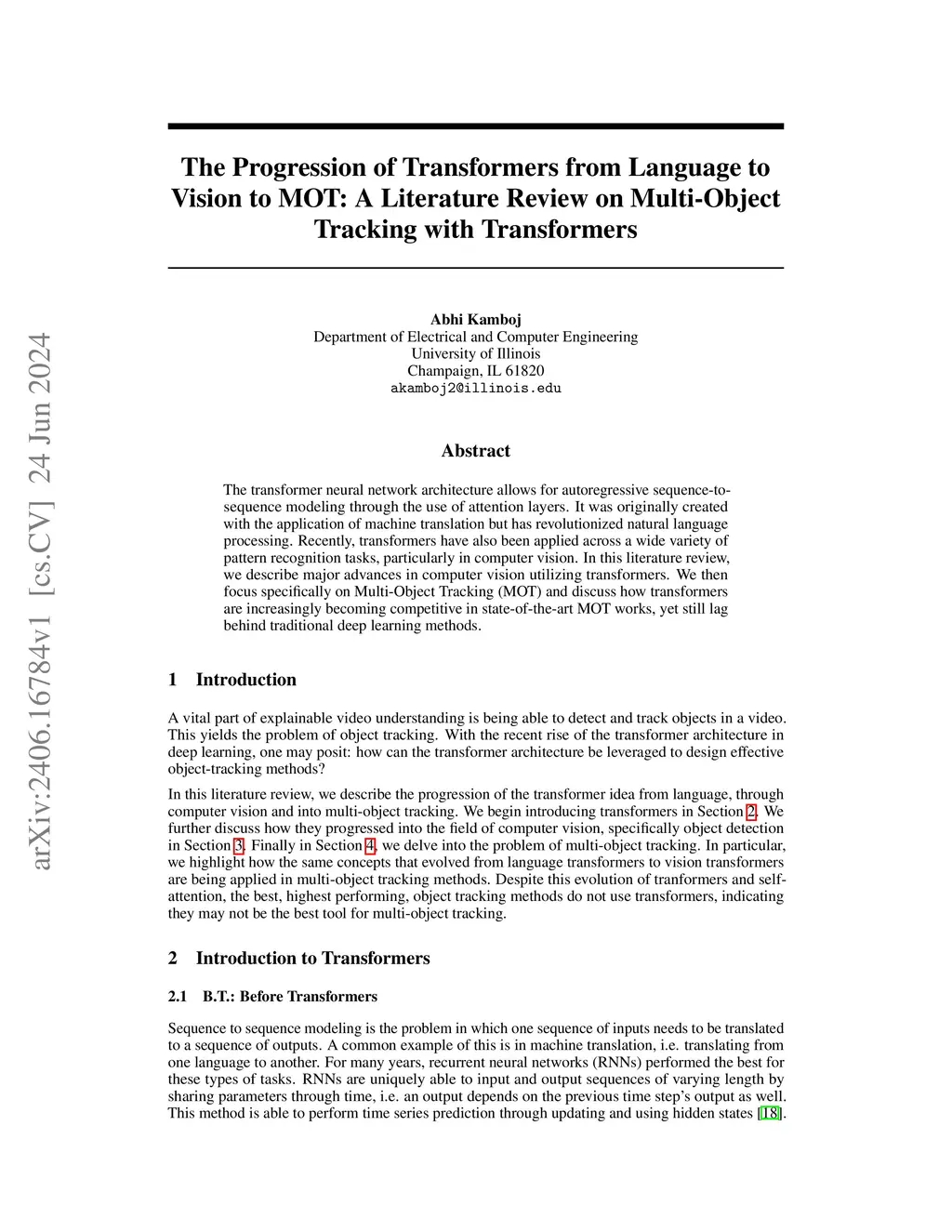 The transformer neural network architecture allows for autoregressive sequence-to-sequence modeling through the use of attention layers. It was originally created with the application of machine translation but has revolutionized natural language processing. Recently, transformers have also been applied across a wide variety of pattern recognition tasks, particularly in computer vision. In this literature review, we describe major advances in computer vision utilizing transformers. We then focus specifically on Multi-Object Tracking (MOT) and discuss how transformers are increasingly becoming competitive in state-of-the-art MOT works, yet still lag behind traditional deep learning methods.