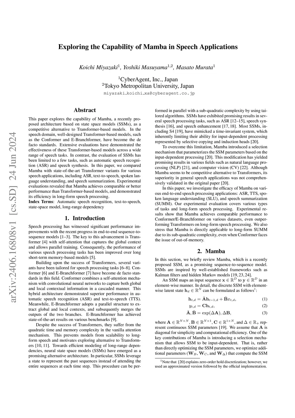 This paper explores the capability of Mamba, a recently proposed architecture based on state space models (SSMs), as a competitive alternative to Transformer-based models. In the speech domain, well-designed Transformer-based models, such as the Conformer and E-Branchformer, have become the de facto standards. Extensive evaluations have demonstrated the effectiveness of these Transformer-based models across a wide range of speech tasks. In contrast, the evaluation of SSMs has been limited to a few tasks, such as automatic speech recognition (ASR) and speech synthesis. In this paper, we compared Mamba with state-of-the-art Transformer variants for various speech applications, including ASR, text-to-speech, spoken language understanding, and speech summarization. Experimental evaluations revealed that Mamba achieves comparable or better performance than Transformer-based models, and demonstrated its efficiency in long-form speech processing.