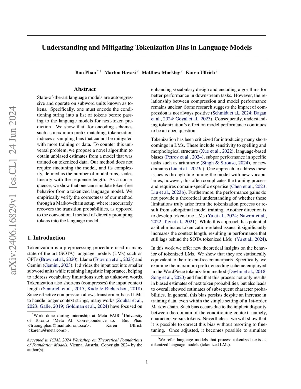 State-of-the-art language models are autoregressive and operate on subword units known as tokens. Specifically, one must encode the conditioning string into a list of tokens before passing to the language models for next-token prediction. We show that popular encoding schemes, such as maximum prefix encoding (MPE) and byte-pair-encoding (BPE), induce a sampling bias that cannot be mitigated with more training or data. To counter this universal problem, for each encoding scheme above, we propose a novel algorithm to obtain unbiased estimates from any language model trained on tokenized data. Our methods do not require finetuning the model, and the complexity, defined as the number of model runs, scales linearly with the sequence length in the case of MPE. As a result, we show that one can simulate token-free behavior from a tokenized language model. We empirically verify the correctness of our method through a Markov-chain setup, where it accurately recovers the transition probabilities, as opposed to the conventional method of directly prompting tokens into the language model.
