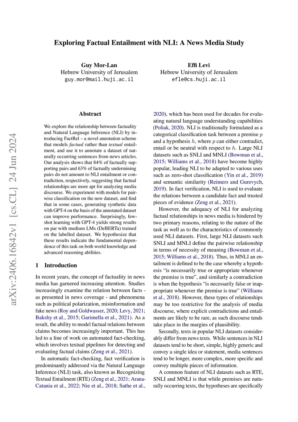 We explore the relationship between factuality and Natural Language Inference (NLI) by introducing FactRel -- a novel annotation scheme that models \textit{factual} rather than \textit{textual} entailment, and use it to annotate a dataset of naturally occurring sentences from news articles. Our analysis shows that 84\% of factually supporting pairs and 63\% of factually undermining pairs do not amount to NLI entailment or contradiction, respectively, suggesting that factual relationships are more apt for analyzing media discourse. We experiment with models for pairwise classification on the new dataset, and find that in some cases, generating synthetic data with GPT-4 on the basis of the annotated dataset can improve performance. Surprisingly, few-shot learning with GPT-4 yields strong results on par with medium LMs (DeBERTa) trained on the labelled dataset. We hypothesize that these results indicate the fundamental dependence of this task on both world knowledge and advanced reasoning abilities.