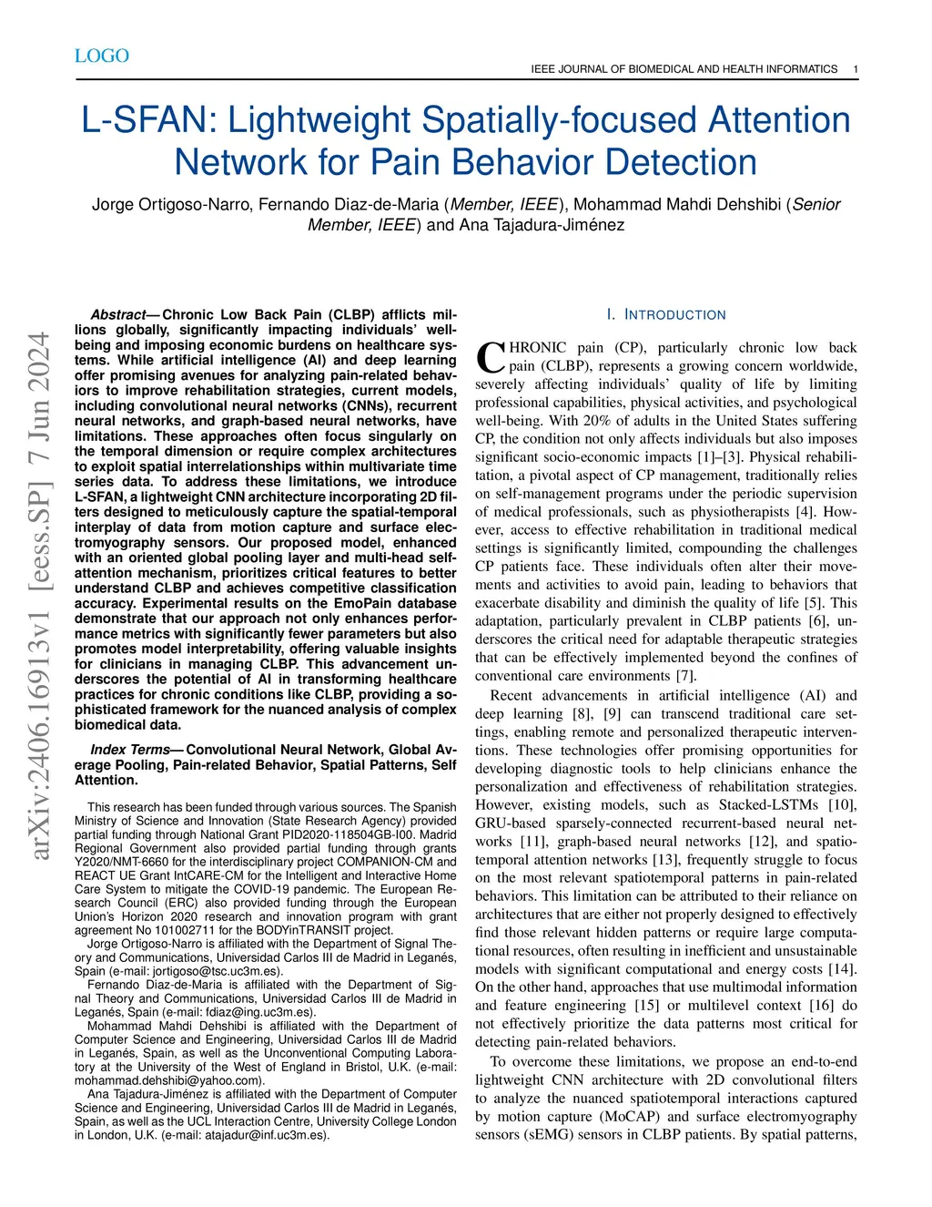 Chronic Low Back Pain (CLBP) afflicts millions globally, significantly impacting individuals' well-being and imposing economic burdens on healthcare systems. While artificial intelligence (AI) and deep learning offer promising avenues for analyzing pain-related behaviors to improve rehabilitation strategies, current models, including convolutional neural networks (CNNs), recurrent neural networks, and graph-based neural networks, have limitations. These approaches often focus singularly on the temporal dimension or require complex architectures to exploit spatial interrelationships within multivariate time series data. To address these limitations, we introduce \hbox{L-SFAN}, a lightweight CNN architecture incorporating 2D filters designed to meticulously capture the spatial-temporal interplay of data from motion capture and surface electromyography sensors. Our proposed model, enhanced with an oriented global pooling layer and multi-head self-attention mechanism, prioritizes critical features to better understand CLBP and achieves competitive classification accuracy. Experimental results on the EmoPain database demonstrate that our approach not only enhances performance metrics with significantly fewer parameters but also promotes model interpretability, offering valuable insights for clinicians in managing CLBP. This advancement underscores the potential of AI in transforming healthcare practices for chronic conditions like CLBP, providing a sophisticated framework for the nuanced analysis of complex biomedical data.