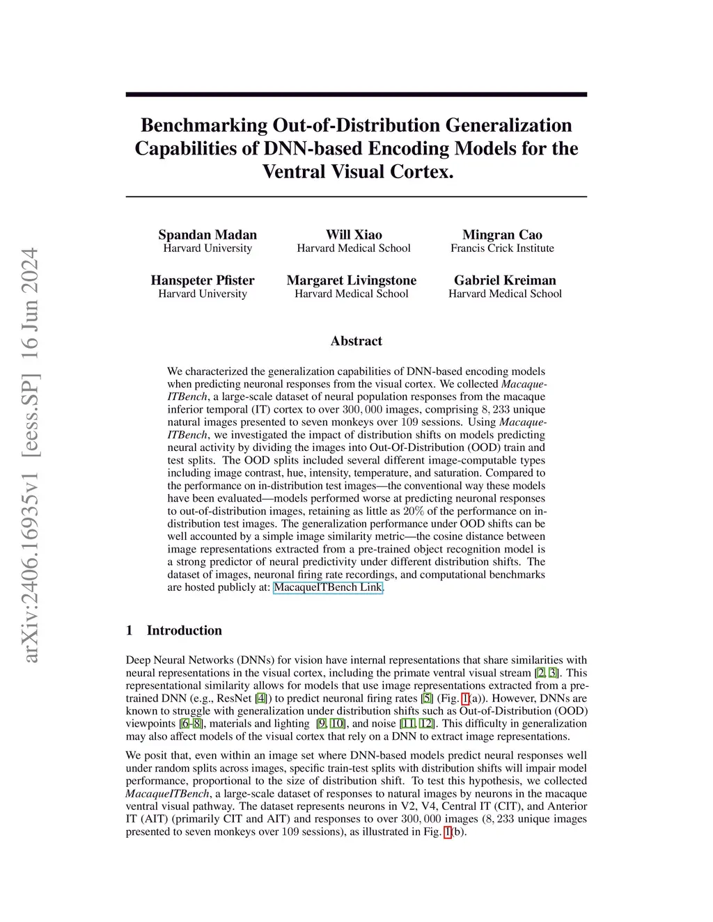 We characterized the generalization capabilities of DNN-based encoding models when predicting neuronal responses from the visual cortex. We collected \textit{MacaqueITBench}, a large-scale dataset of neural population responses from the macaque inferior temporal (IT) cortex to over images, comprising unique natural images presented to seven monkeys over sessions. Using \textit{MacaqueITBench}, we investigated the impact of distribution shifts on models predicting neural activity by dividing the images into Out-Of-Distribution (OOD) train and test splits. The OOD splits included several different image-computable types including image contrast, hue, intensity, temperature, and saturation. Compared to the performance on in-distribution test images -- the conventional way these models have been evaluated -- models performed worse at predicting neuronal responses to out-of-distribution images, retaining as little as of the performance on in-distribution test images. The generalization performance under OOD shifts can be well accounted by a simple image similarity metric -- the cosine distance between image representations extracted from a pre-trained object recognition model is a strong predictor of neural predictivity under different distribution shifts. The dataset of images, neuronal firing rate recordings, and computational benchmarks are hosted publicly at: https://bit.ly/3zeutVd.
