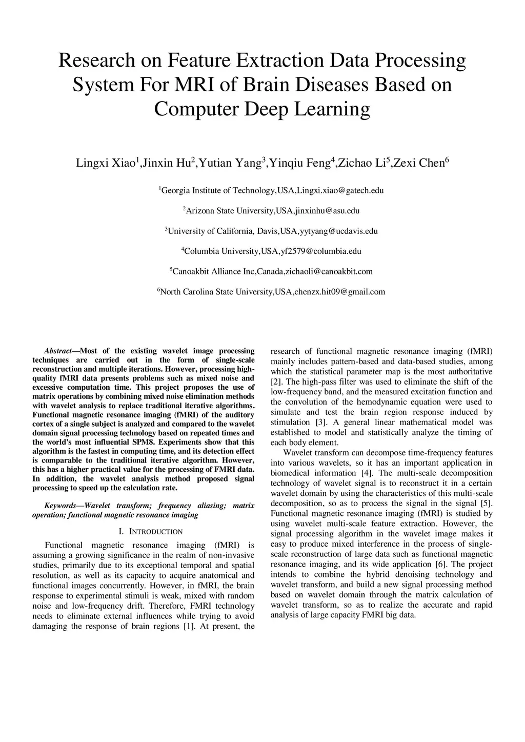 Most of the existing wavelet image processing techniques are carried out in the form of single-scale reconstruction and multiple iterations. However, processing high-quality fMRI data presents problems such as mixed noise and excessive computation time. This project proposes the use of matrix operations by combining mixed noise elimination methods with wavelet analysis to replace traditional iterative algorithms. Functional magnetic resonance imaging (fMRI) of the auditory cortex of a single subject is analyzed and compared to the wavelet domain signal processing technology based on repeated times and the world's most influential SPM8. Experiments show that this algorithm is the fastest in computing time, and its detection effect is comparable to the traditional iterative algorithm. However, this has a higher practical value for the processing of FMRI data. In addition, the wavelet analysis method proposed signal processing to speed up the calculation rate.