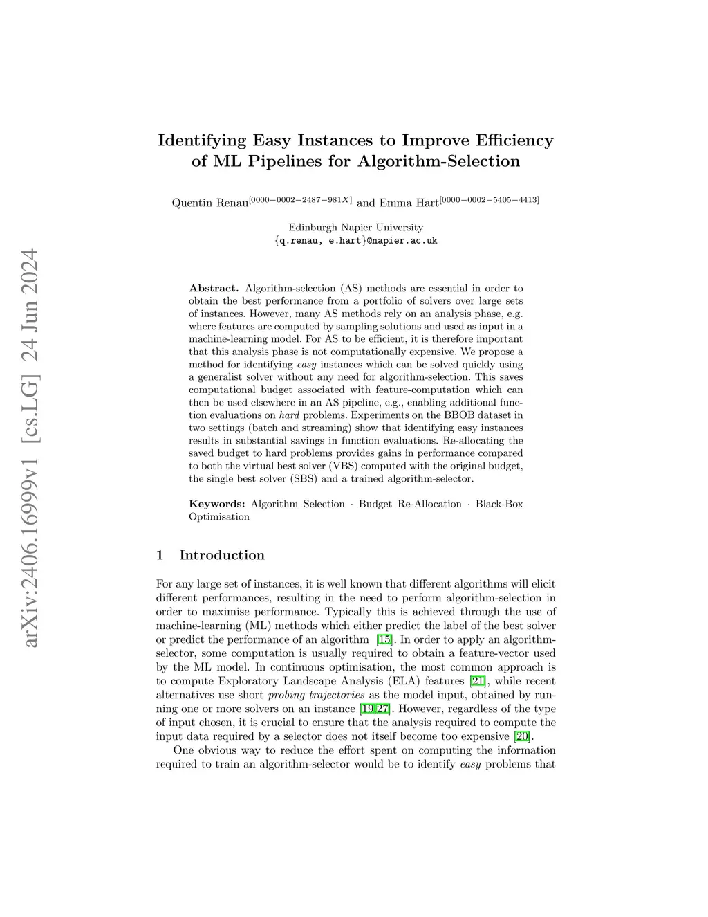 Algorithm-selection (AS) methods are essential in order to obtain the best performance from a portfolio of solvers over large sets of instances. However, many AS methods rely on an analysis phase, e.g. where features are computed by sampling solutions and used as input in a machine-learning model. For AS to be efficient, it is therefore important that this analysis phase is not computationally expensive. We propose a method for identifying easy instances which can be solved quickly using a generalist solver without any need for algorithm-selection. This saves computational budget associated with feature-computation which can then be used elsewhere in an AS pipeline, e.g., enabling additional function evaluations on hard problems. Experiments on the BBOB dataset in two settings (batch and streaming) show that identifying easy instances results in substantial savings in function evaluations. Re-allocating the saved budget to hard problems provides gains in performance compared to both the virtual best solver (VBS) computed with the original budget, the single best solver (SBS) and a trained algorithm-selector.
