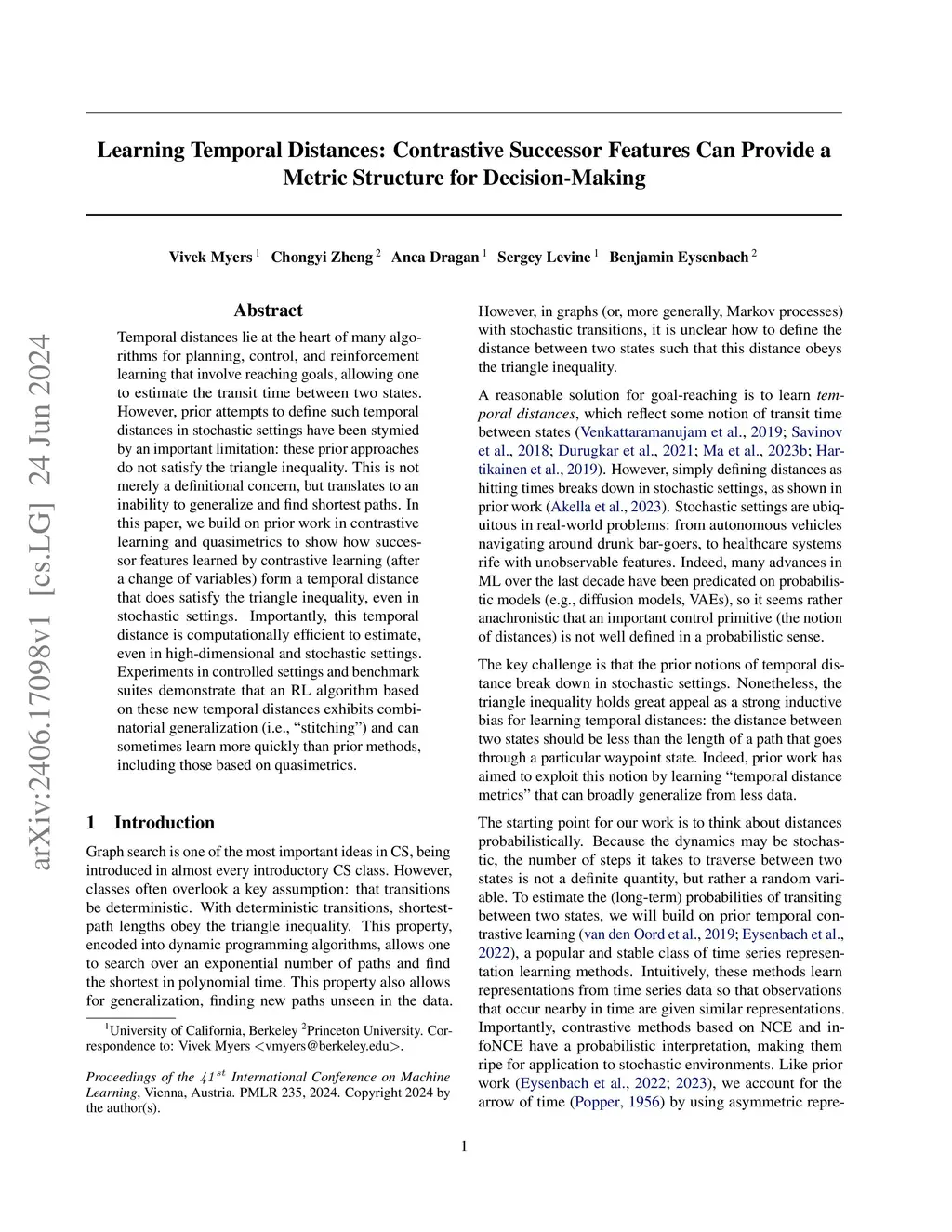 Temporal distances lie at the heart of many algorithms for planning, control, and reinforcement learning that involve reaching goals, allowing one to estimate the transit time between two states. However, prior attempts to define such temporal distances in stochastic settings have been stymied by an important limitation: these prior approaches do not satisfy the triangle inequality. This is not merely a definitional concern, but translates to an inability to generalize and find shortest paths. In this paper, we build on prior work in contrastive learning and quasimetrics to show how successor features learned by contrastive learning (after a change of variables) form a temporal distance that does satisfy the triangle inequality, even in stochastic settings. Importantly, this temporal distance is computationally efficient to estimate, even in high-dimensional and stochastic settings. Experiments in controlled settings and benchmark suites demonstrate that an RL algorithm based on these new temporal distances exhibits combinatorial generalization (i.e., "stitching") and can sometimes learn more quickly than prior methods, including those based on quasimetrics.