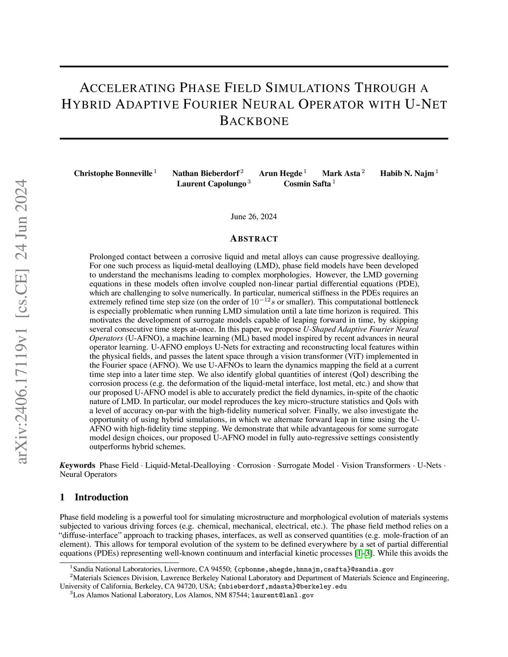 Prolonged contact between a corrosive liquid and metal alloys can cause progressive dealloying. For such liquid-metal dealloying (LMD) process, phase field models have been developed. However, the governing equations often involve coupled non-linear partial differential equations (PDE), which are challenging to solve numerically. In particular, stiffness in the PDEs requires an extremely small time steps (e.g. or smaller). This computational bottleneck is especially problematic when running LMD simulation until a late time horizon is required. This motivates the development of surrogate models capable of leaping forward in time, by skipping several consecutive time steps at-once. In this paper, we propose U-Shaped Adaptive Fourier Neural Operators (U-AFNO), a machine learning (ML) model inspired by recent advances in neural operator learning. U-AFNO employs U-Nets for extracting and reconstructing local features within the physical fields, and passes the latent space through a vision transformer (ViT) implemented in the Fourier space (AFNO). We use U-AFNOs to learn the dynamics mapping the field at a current time step into a later time step. We also identify global quantities of interest (QoI) describing the corrosion process (e.g. the deformation of the liquid-metal interface) and show that our proposed U-AFNO model is able to accurately predict the field dynamics, in-spite of the chaotic nature of LMD. Our model reproduces the key micro-structure statistics and QoIs with a level of accuracy on-par with the high-fidelity numerical solver. We also investigate the opportunity of using hybrid simulations, in which we alternate forward leap in time using the U-AFNO with high-fidelity time stepping. We demonstrate that while advantageous for some surrogate model design choices, our proposed U-AFNO model in fully auto-regressive settings consistently outperforms hybrid schemes.